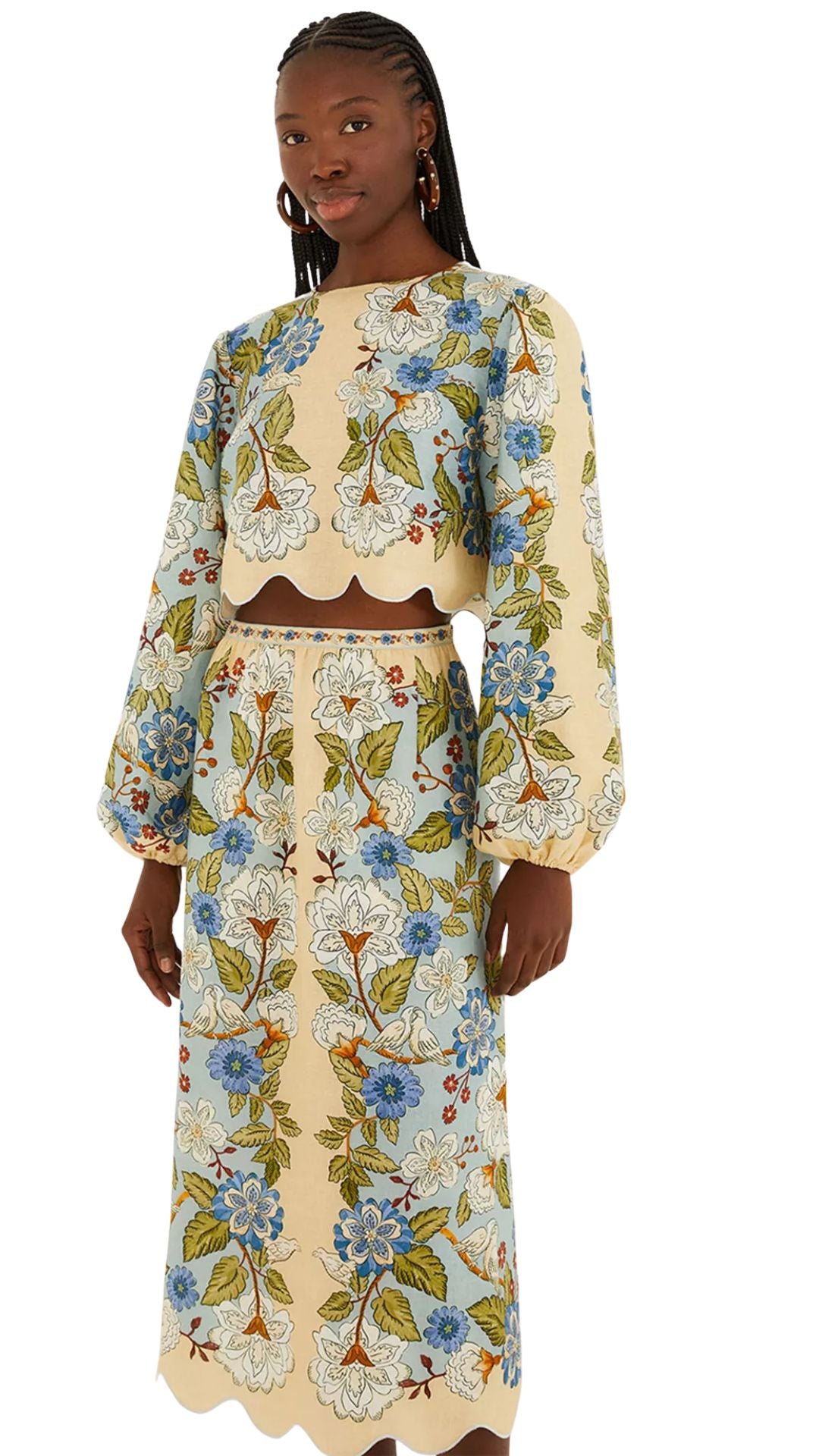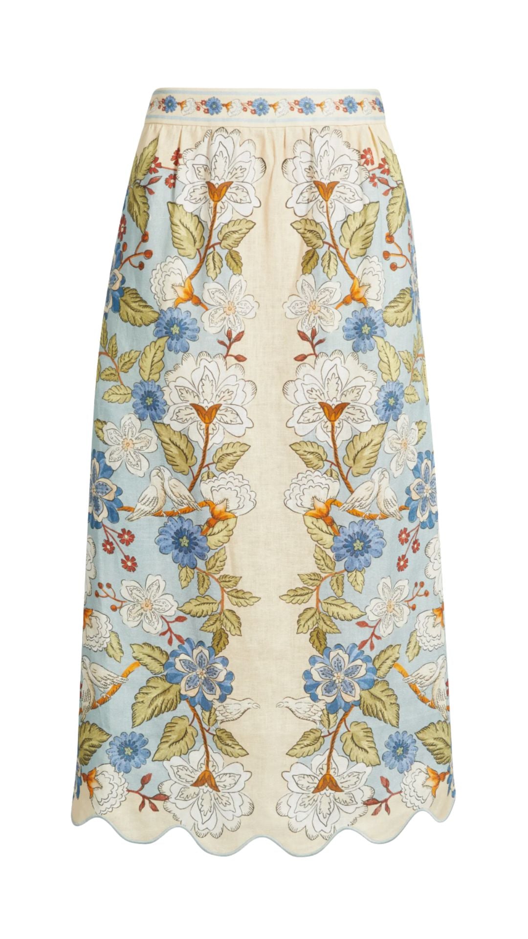 Flowers and doves bring pretty presence to a pure linen midi skirt finished with a dainty scalloped hem.