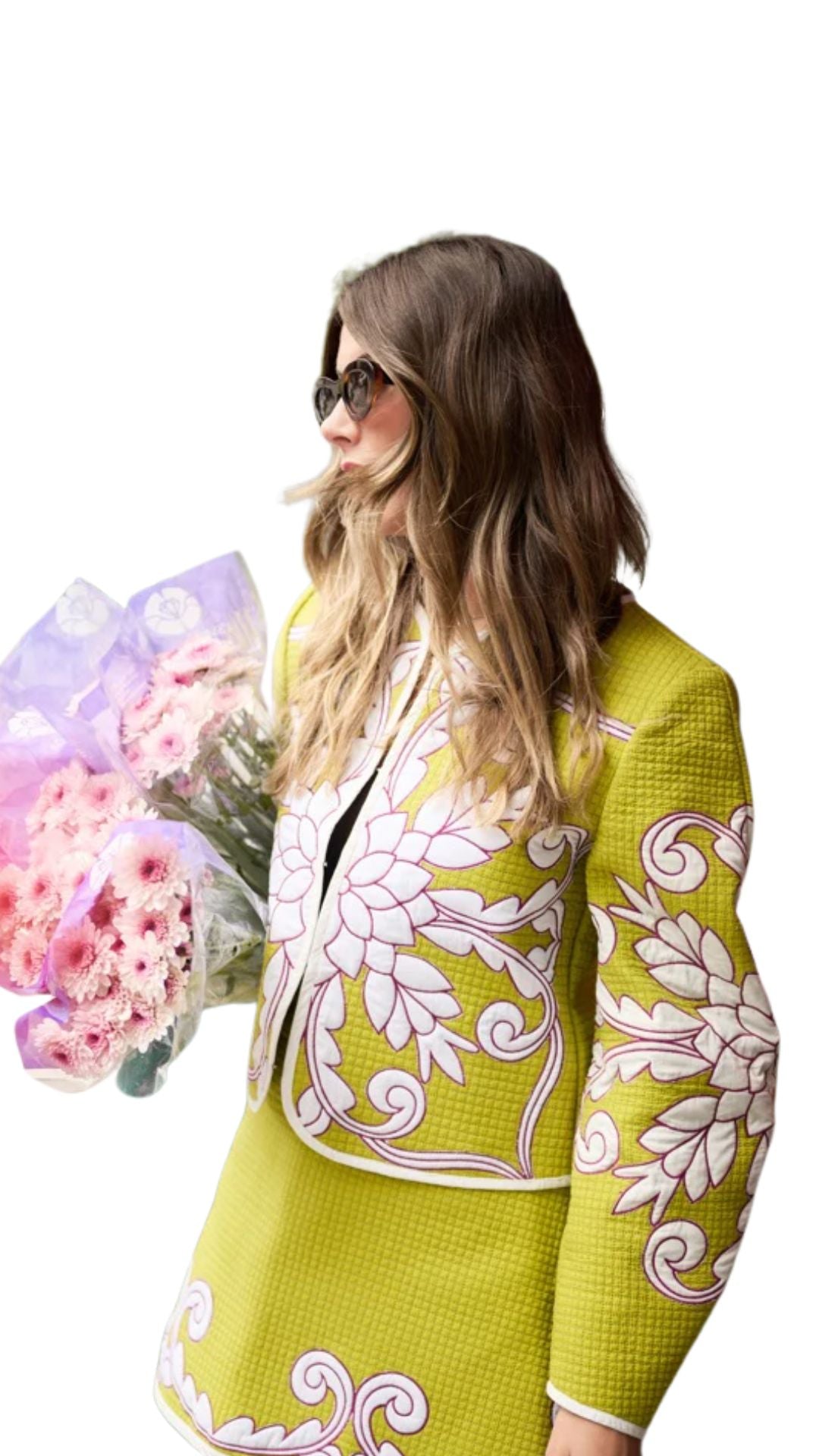 Named after Lawson’s great-grandmother, who passed down the art of sewing through her family, the Mimi Quilted Jacket is a piece stitched with love and legacy. Born from Lawson’s MFA collection, this fitted jacket in an electric chartreuse features sculptural barrel sleeves, framed with white floral appliqué and outlined in maroon embroidery. Wear it with the matching mini skirt for a full look, or style it with jeans and a tank for something more casual. Designed to be worn, loved, and passed down, just like the craft and Portuguese tile work that inspired it.