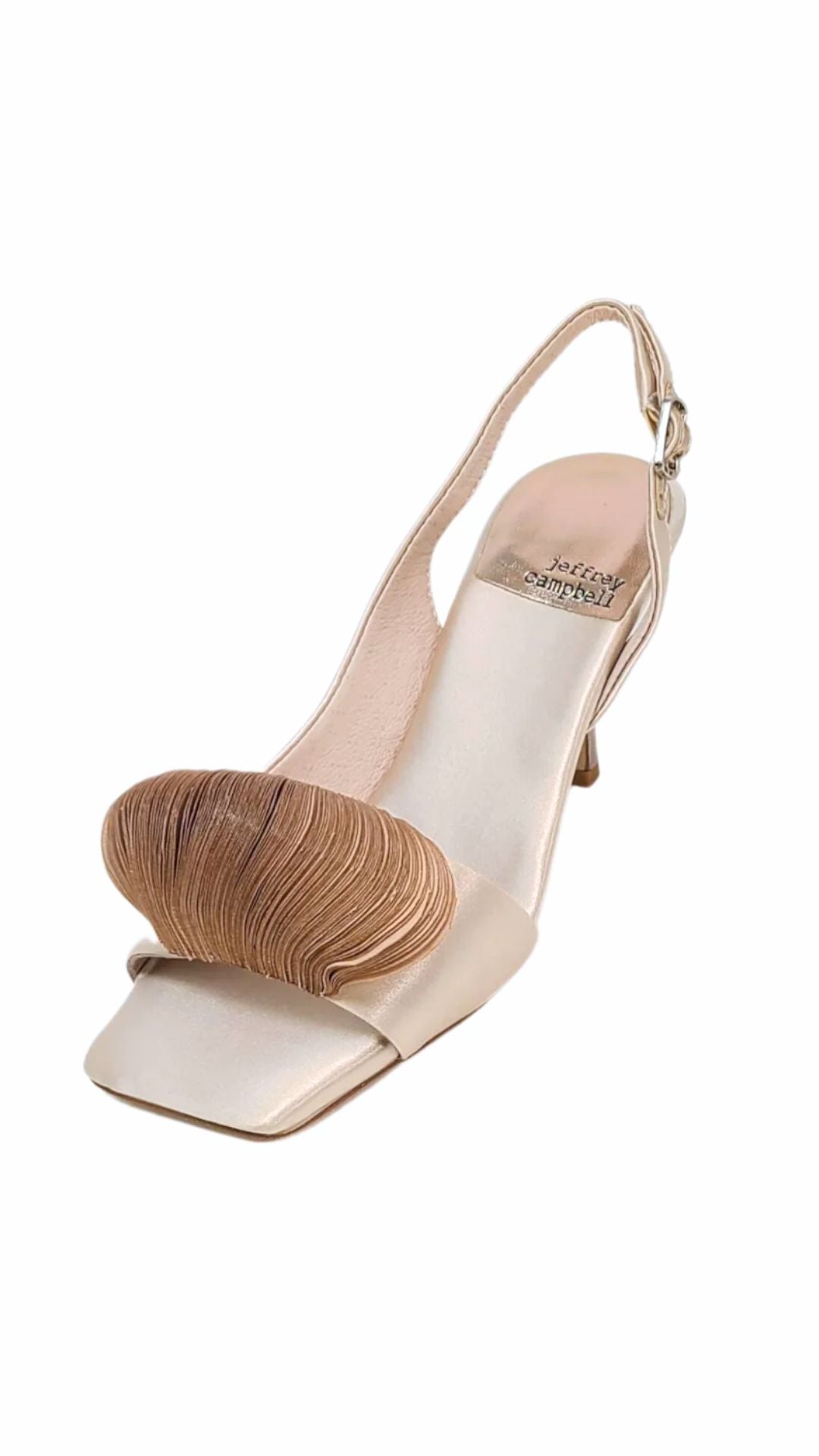 Satin pump with a plume design over the toe. The slingback style buckle strap will add comfort and security to this classic style! The Duffy satin pump by Jeffrey Campbell unites both a classic slingback with a touch of added extra with a with a plume design over the toe.