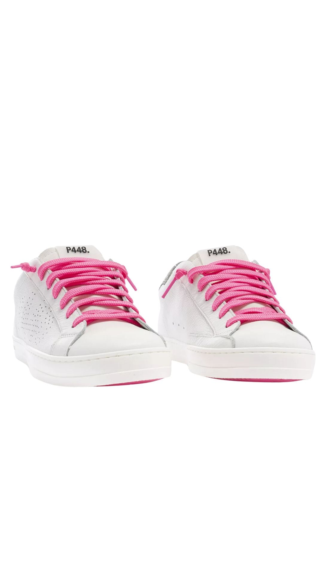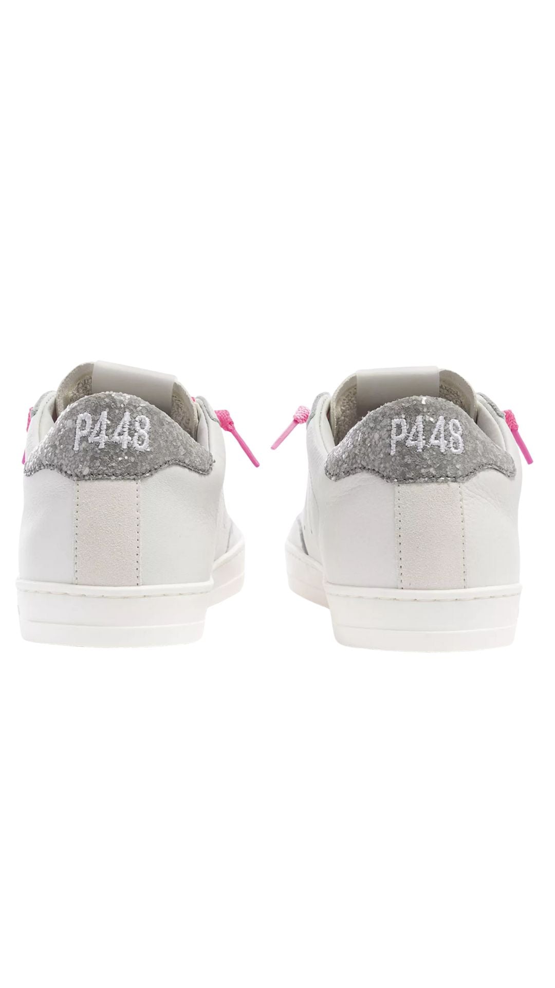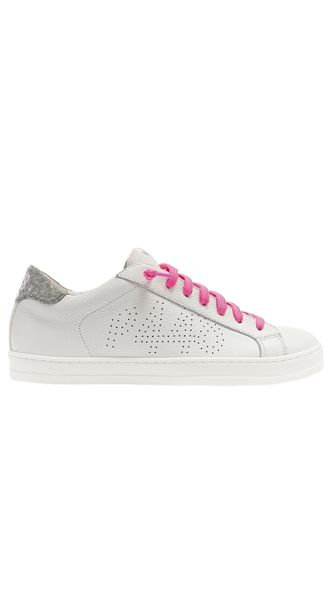 The John Matte/Glitter is wrapped in white leather and suede, accented by a silver glitter heel tab. Fuchsia cotton laces and our signature P448 hand-distressed rubber soles with fuchsia treads tie it all together.