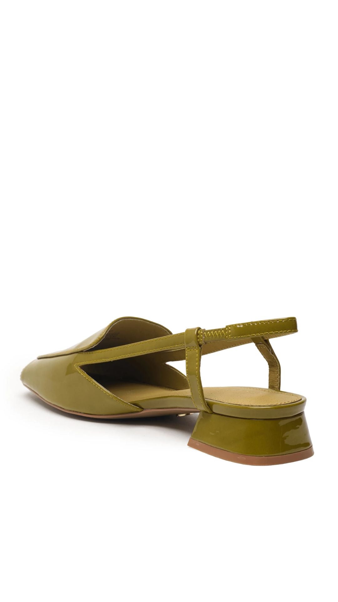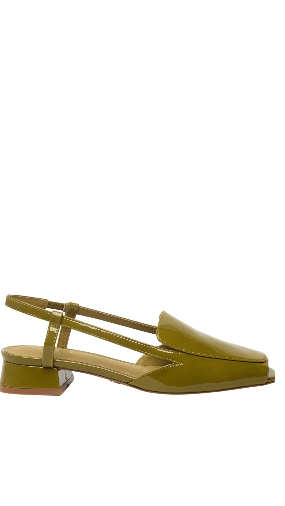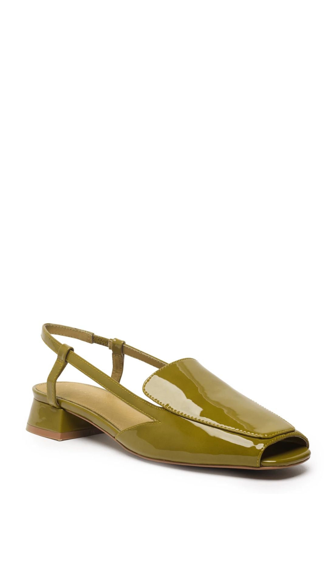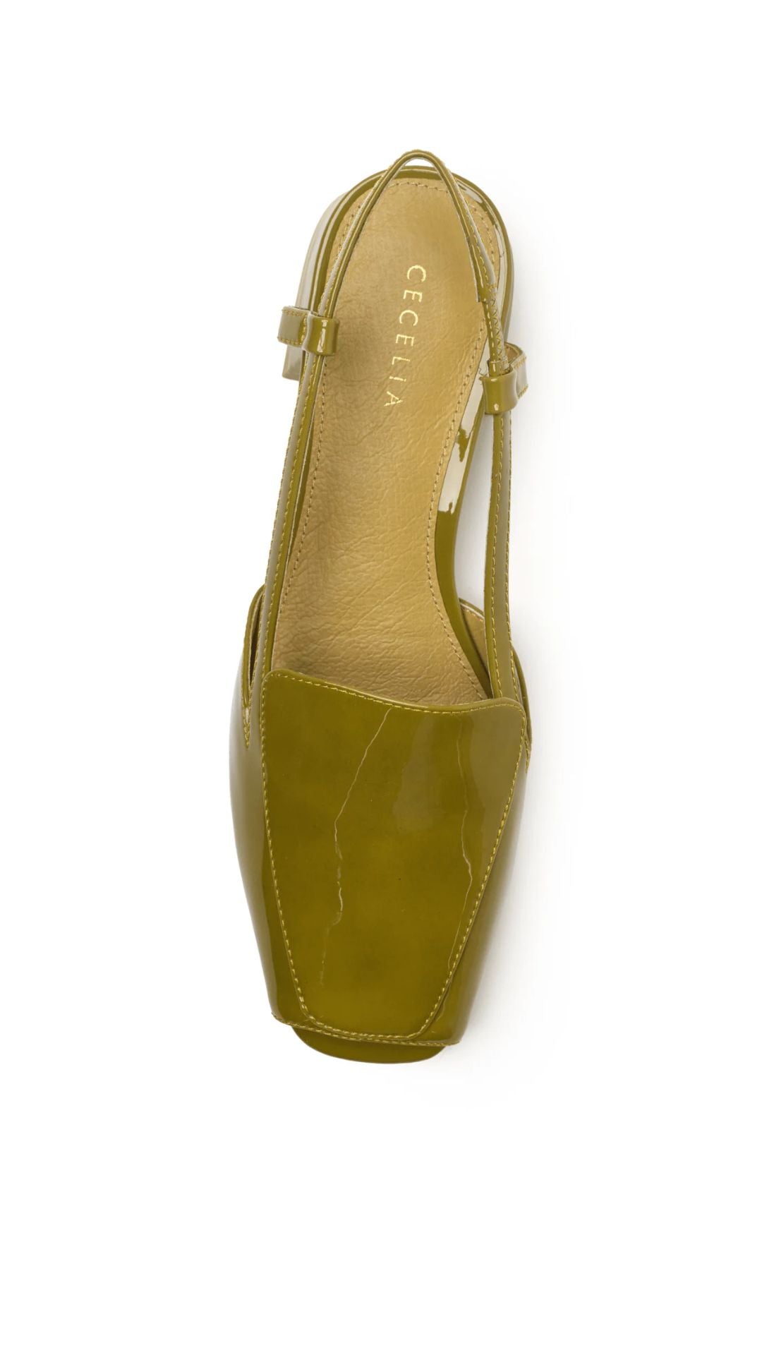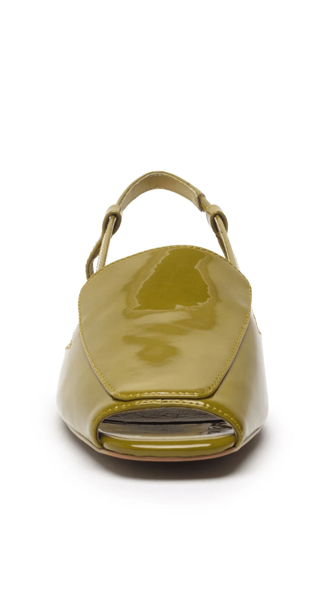 A slingback strap balances the contemporary flat fashioned with a slender square toe.