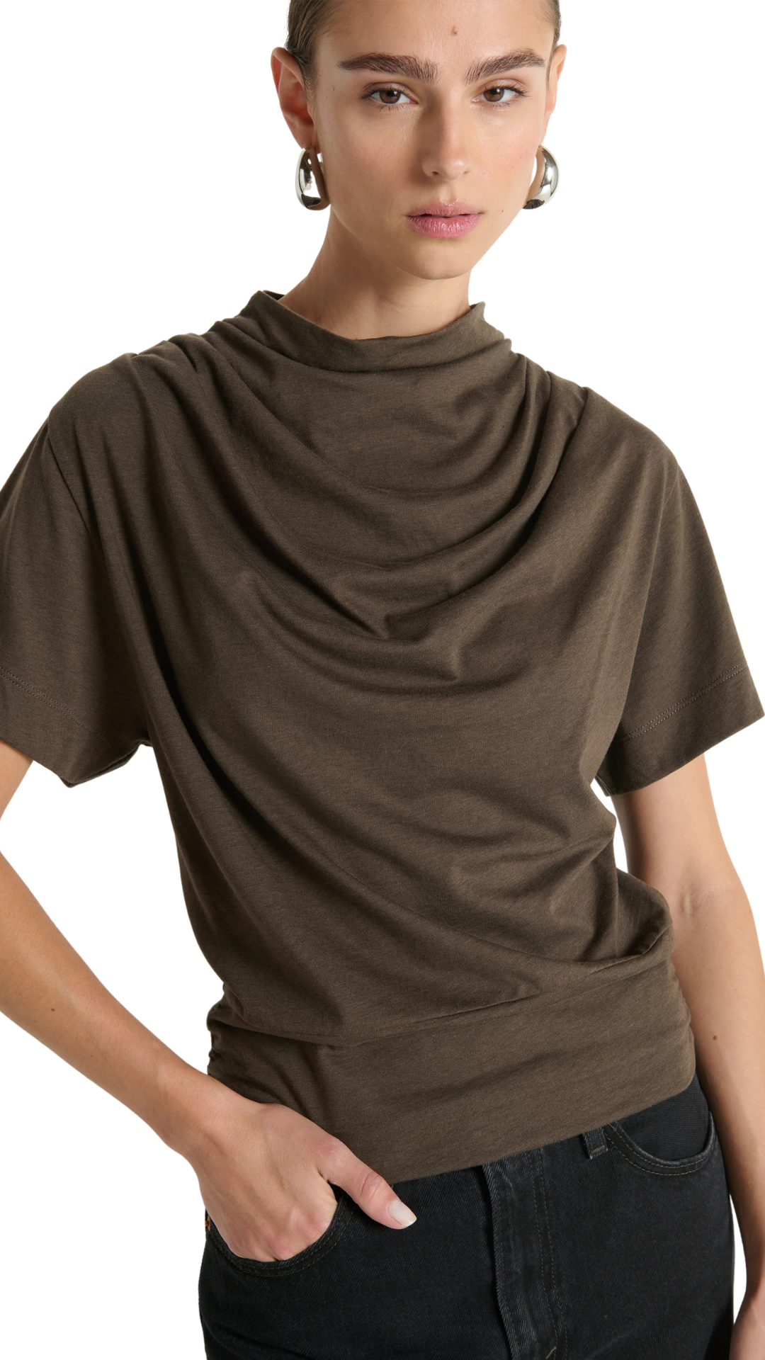 Made in our luxe jersey, the soft cowl neck and drop shoulders drape effortlessly, giving the Daryl Cowlneck Tee piece its understated sophistication.