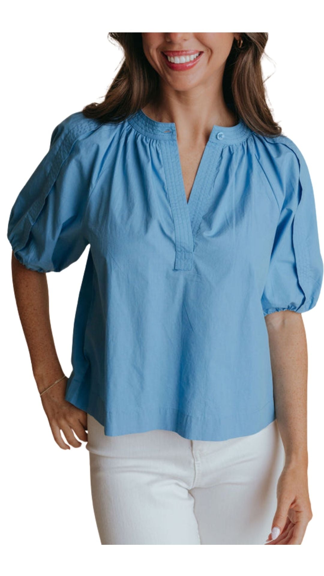 shown in Mist cotton poplin sleeve with elastic cuff open neckline