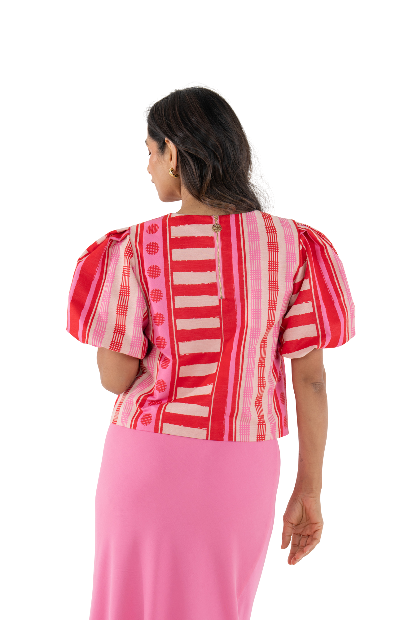 The Jane Top in Peach Jubilee brings an elevated sense of play to everyday dressing. Designed with a boxy silhouette, this statement top balances structure with ease. Voluminous puff sleeves add a touch of drama, creating a confident shape that feels both polished and fun. Peach Jubilee is a lively intermix of patterns, printed on a luxe jacquard fabric that offers subtle structure and a soft sheen. The result is a top that feels thoughtfully designed and effortlessly joyful.