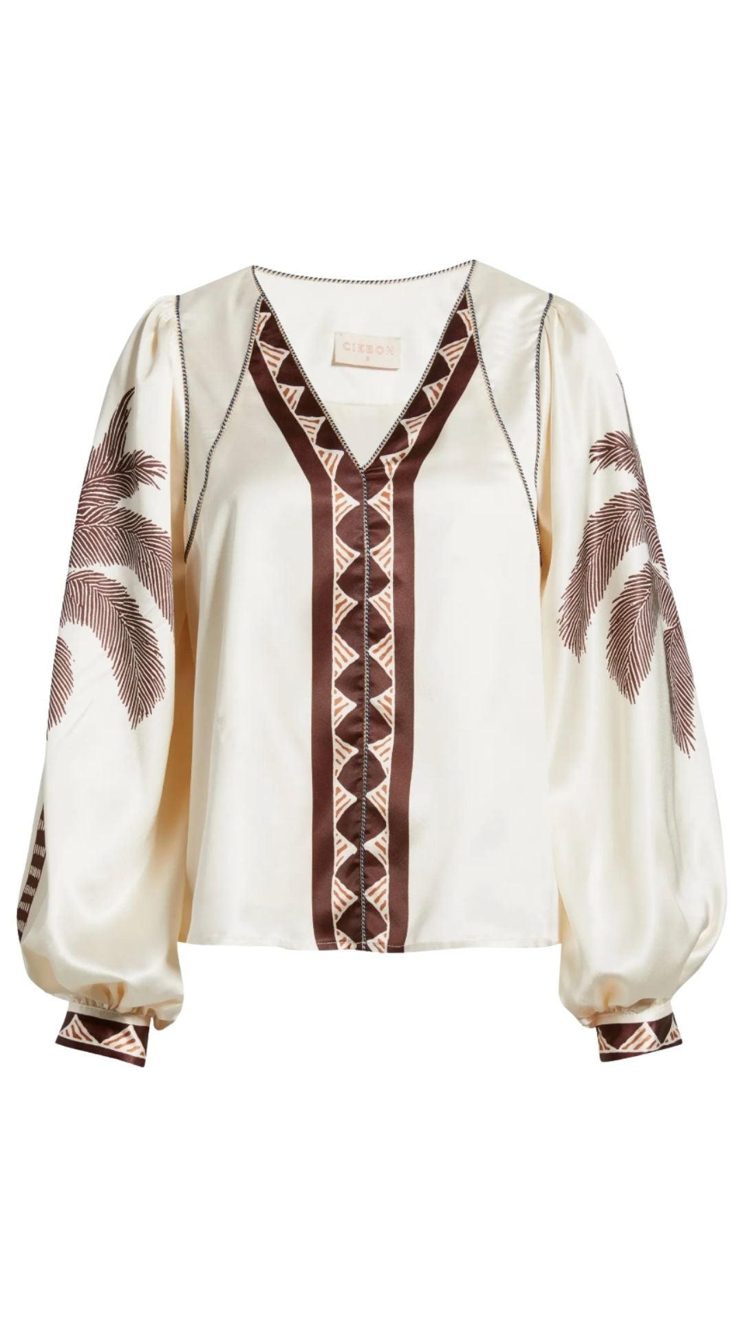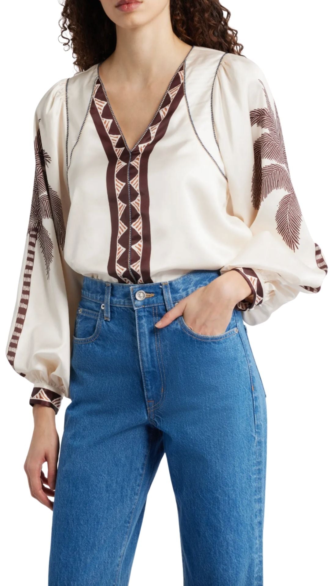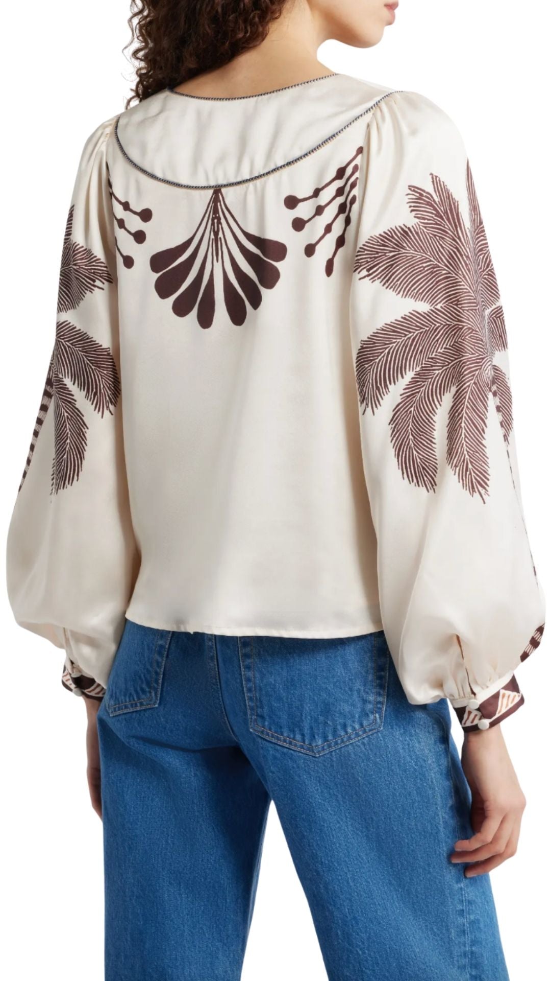 Cut from glossy skin-skimming satin, this blousy V-neck top is made with a destination-inspired palm print and framed by voluminous sleeves.