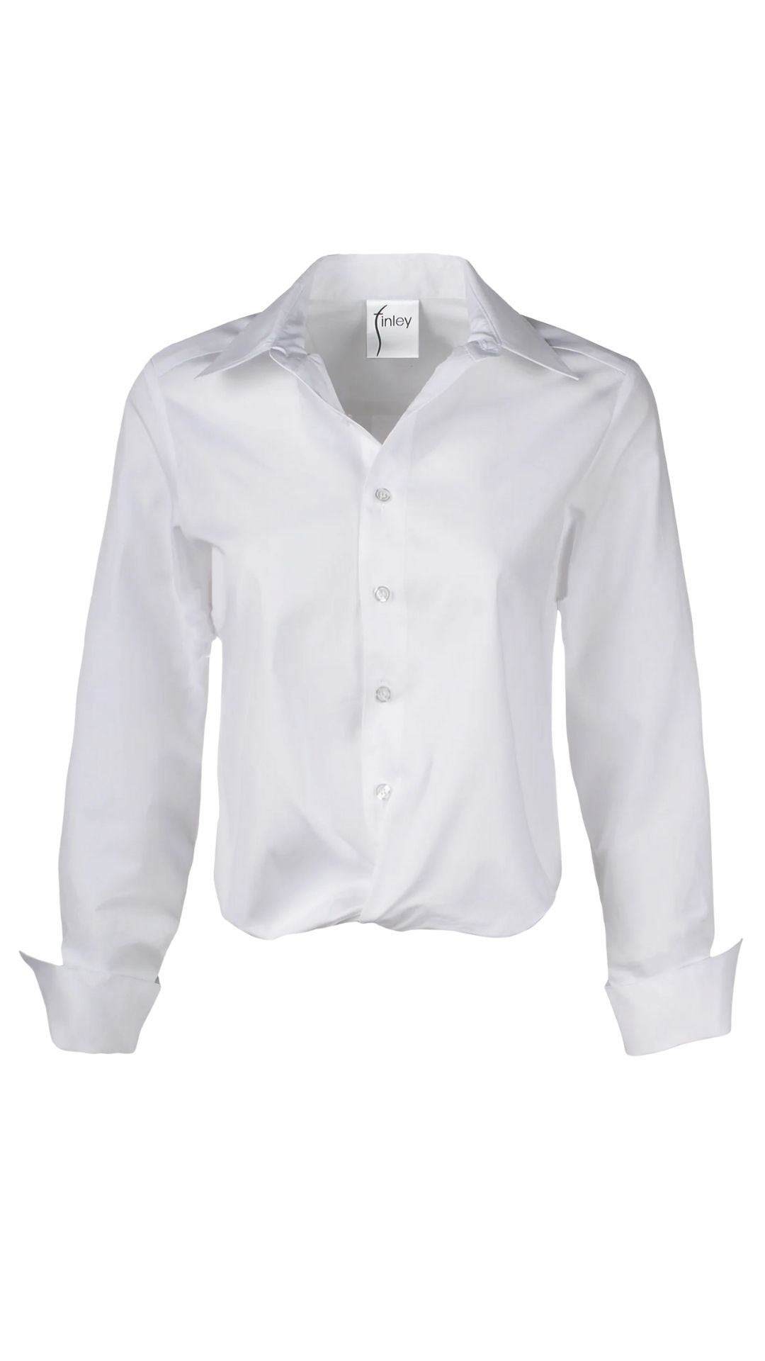 Finley "Moxie" white silky poplin shirt features a front twist at the hem