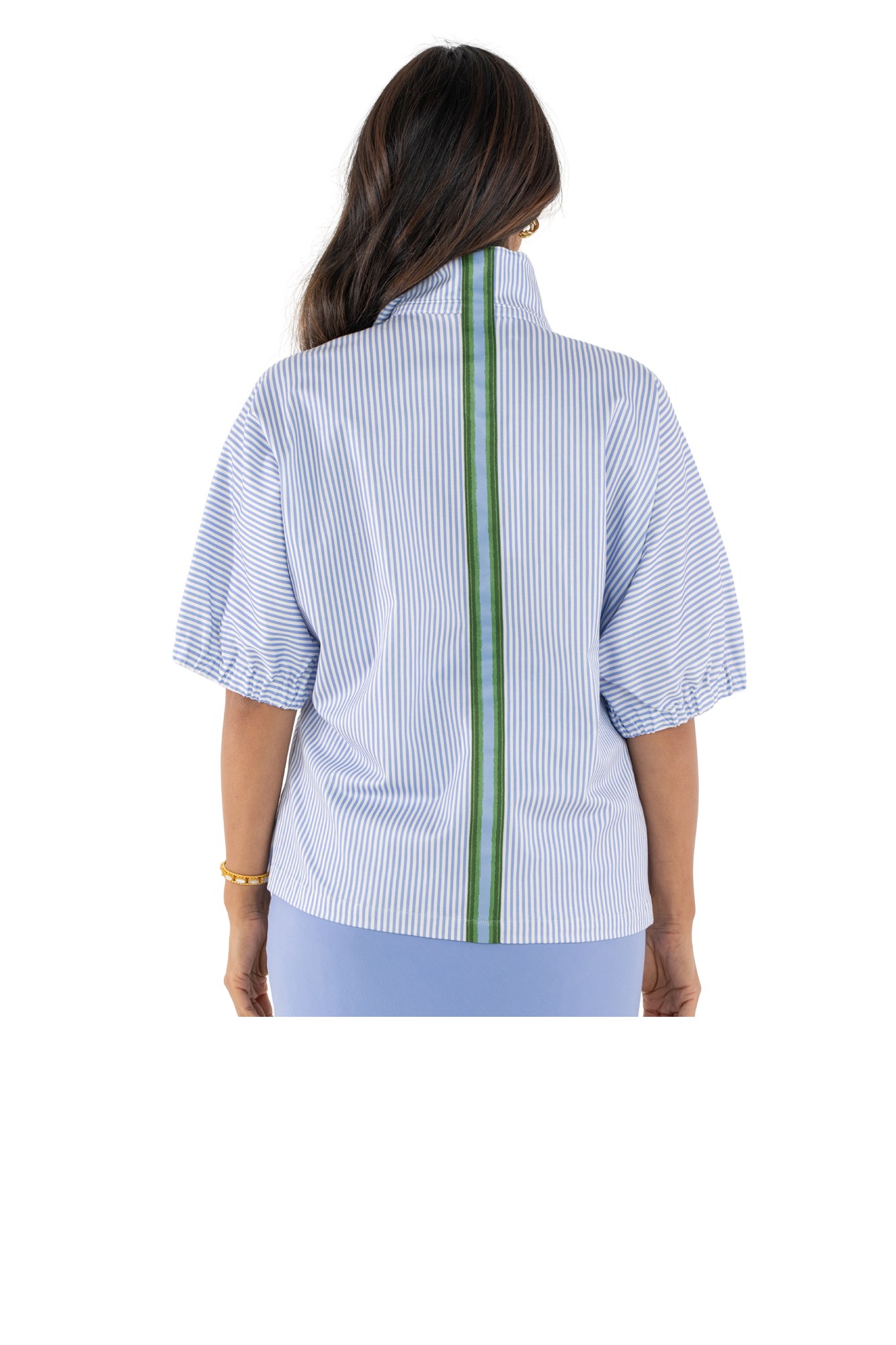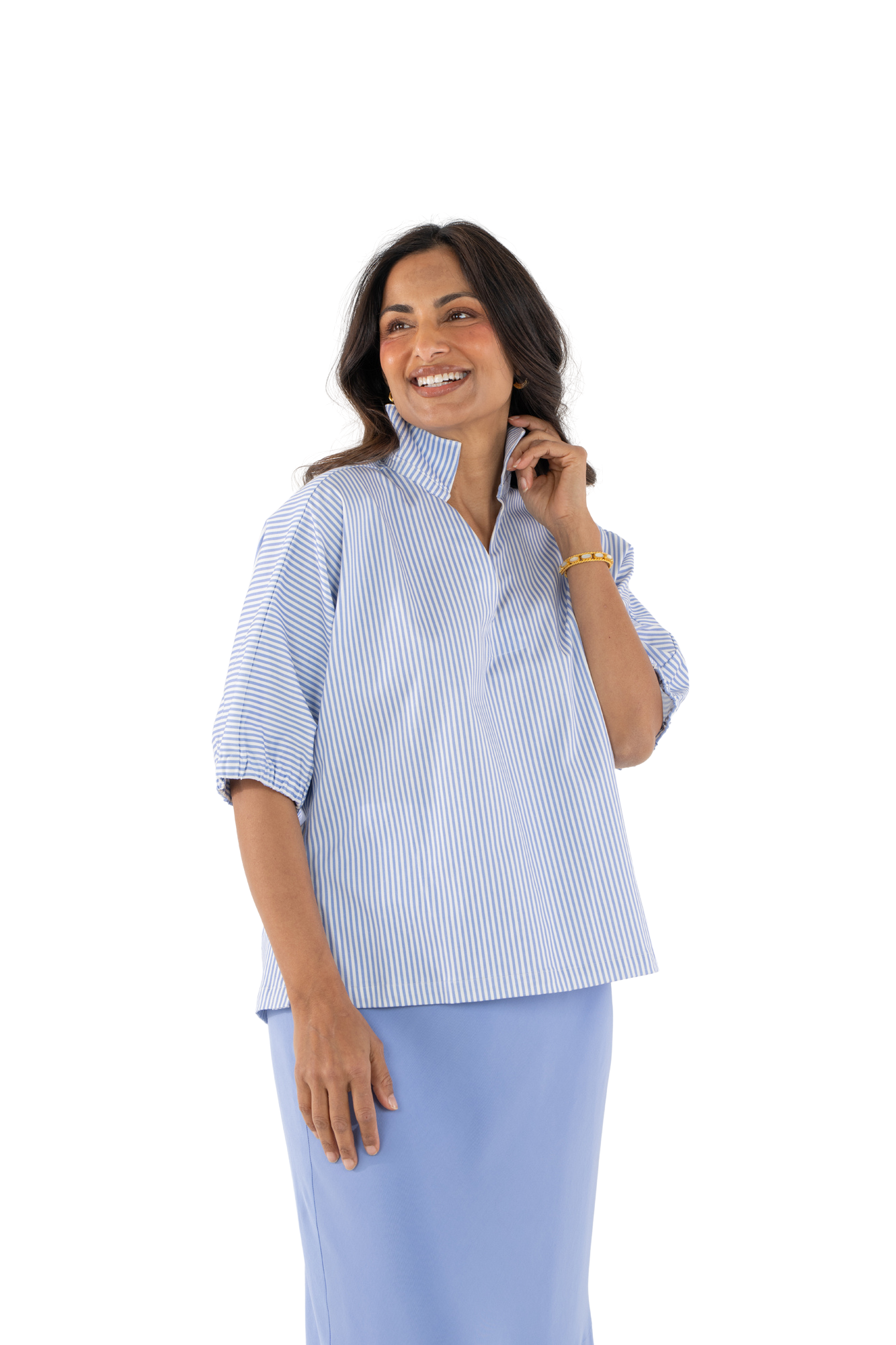 The Poppy Top in Grapemist Stripe is an effortless staple with a playful twist. Designed with a loose, easy silhouette, this style offers a relaxed feel while maintaining a polished look. Soft elastic dolman sleeves add gentle volume, balanced by a classic stand collar for a timeless finish. This top brings a fresh, spring-ready appeal, elevated by an unexpected pop of color along the back with green and blue trim. Thoughtfully detailed and endlessly wearable, this top delivers everyday ease with a touch of joyful distinction.