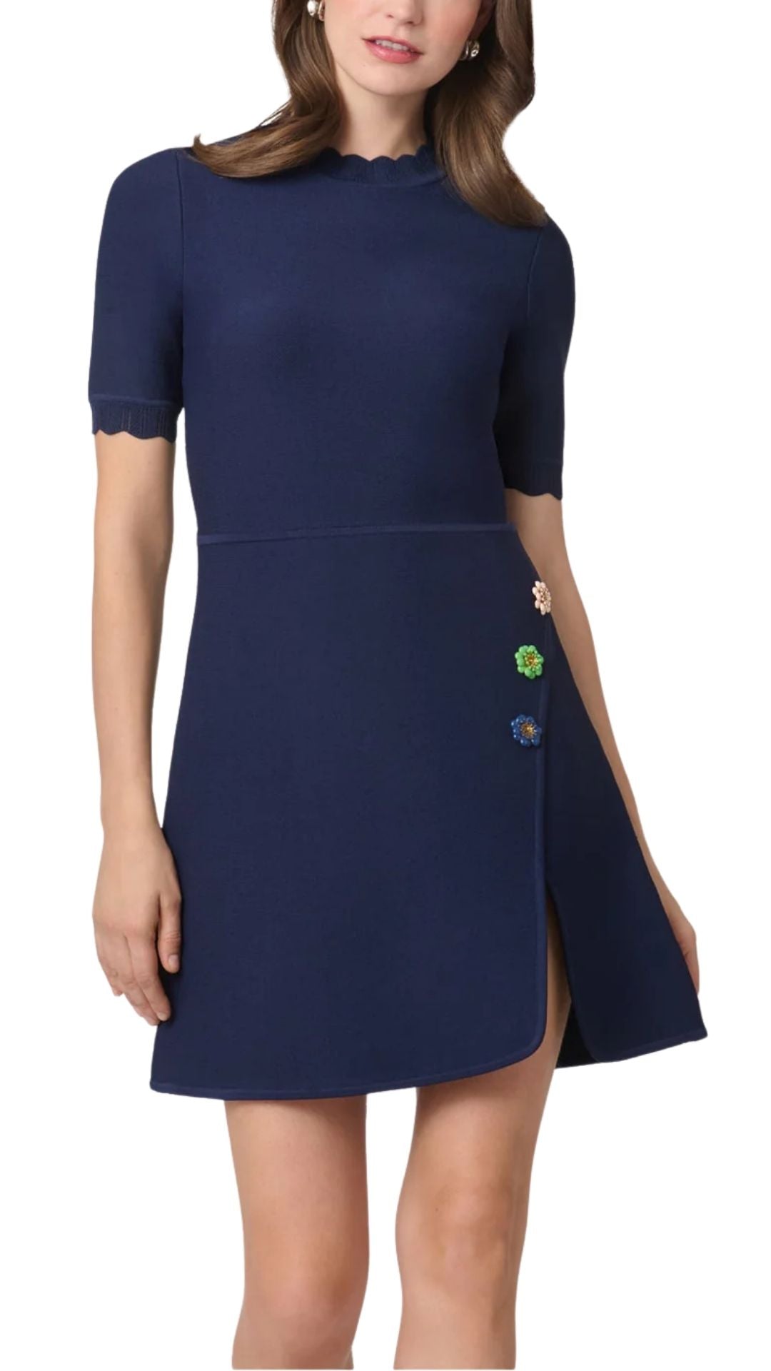 This stunning knit dress features a fitted bodice with an A-line skirt. The neckline and sleeves are accentuated with a scallop knit trim. The skirt has an overlap design and features unique floral detail embellishments. No zipper. Unlined.
