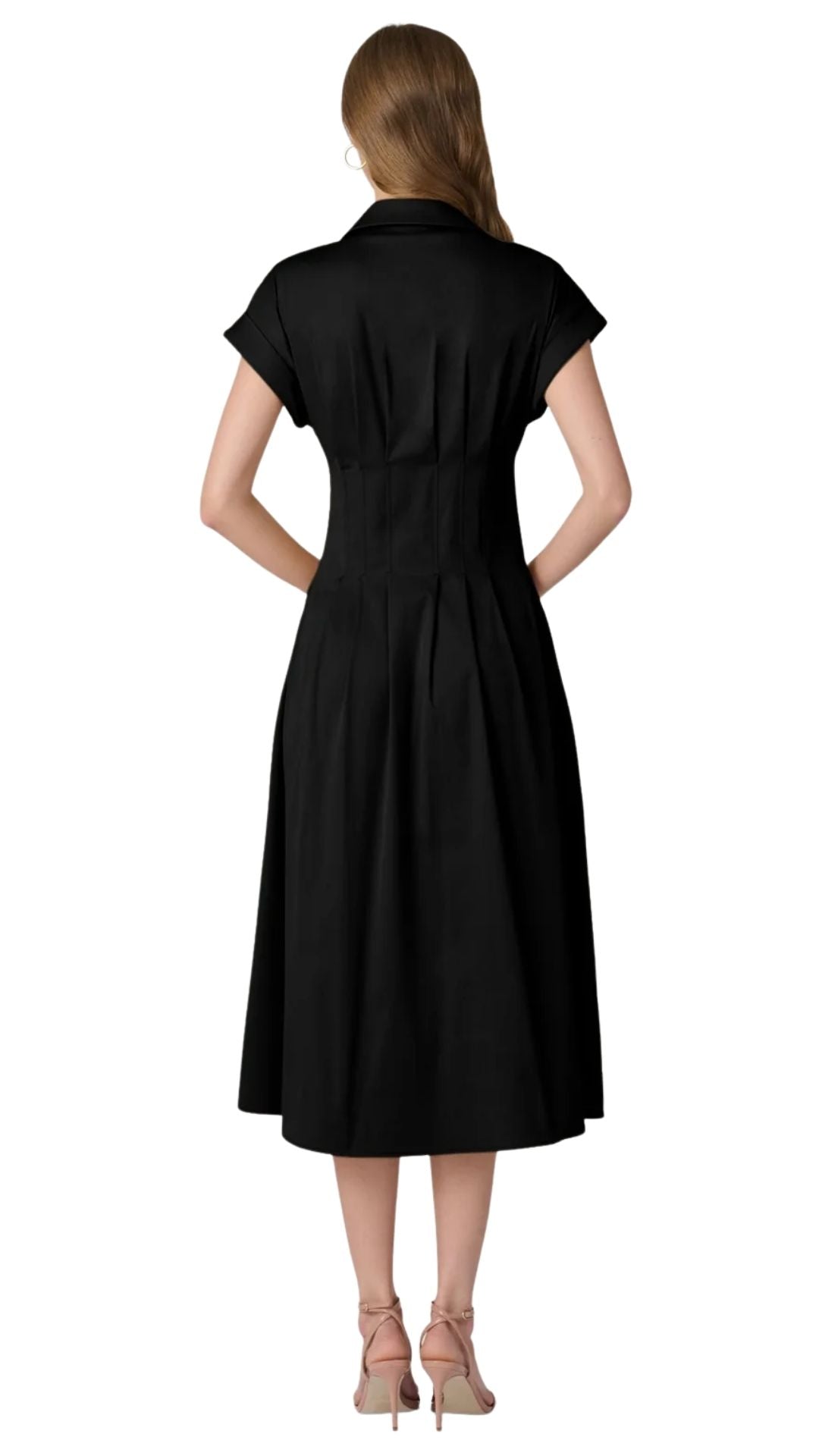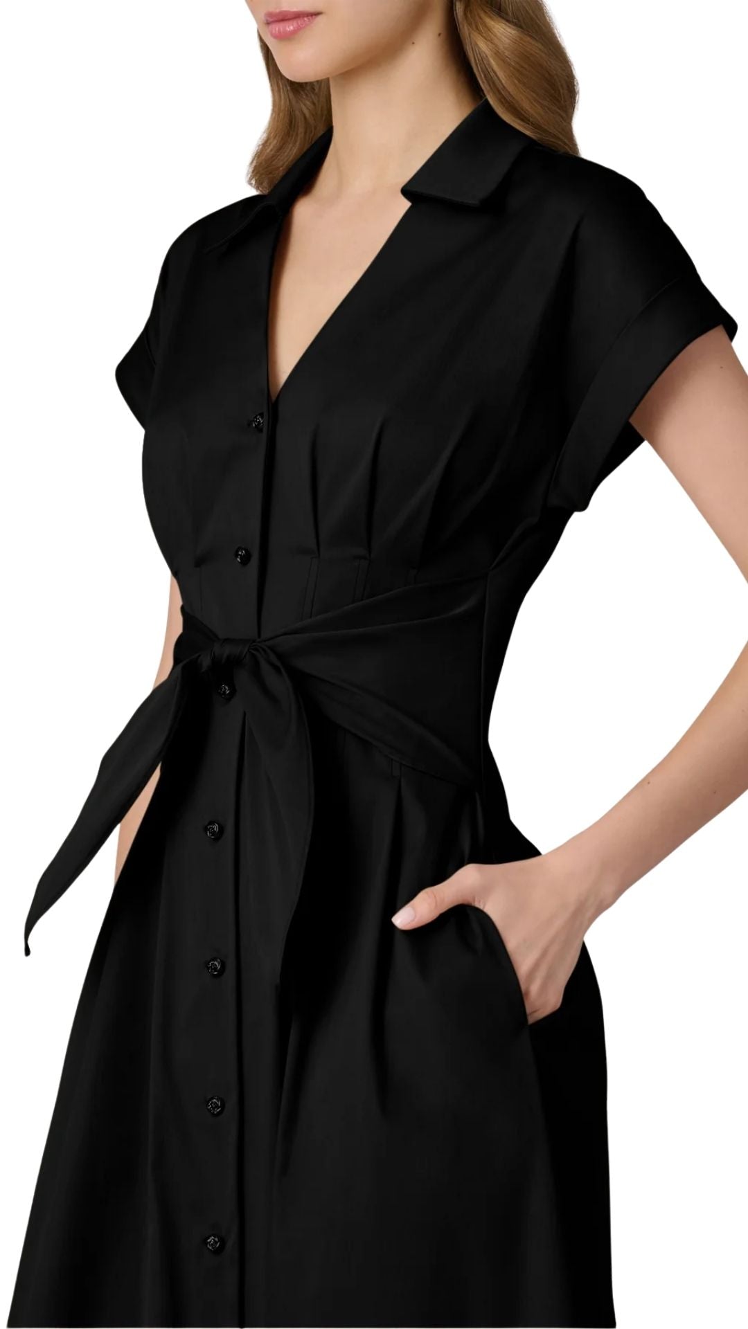 This chic midi shirtdress is made in a beautiful cotton sateen fabric. It features a collared V-neckline and a front closure with detailed gold buttons. The front tie chinches the waist. Unlined. Front button closure.
