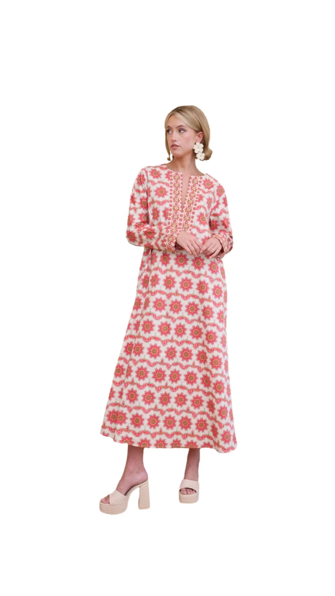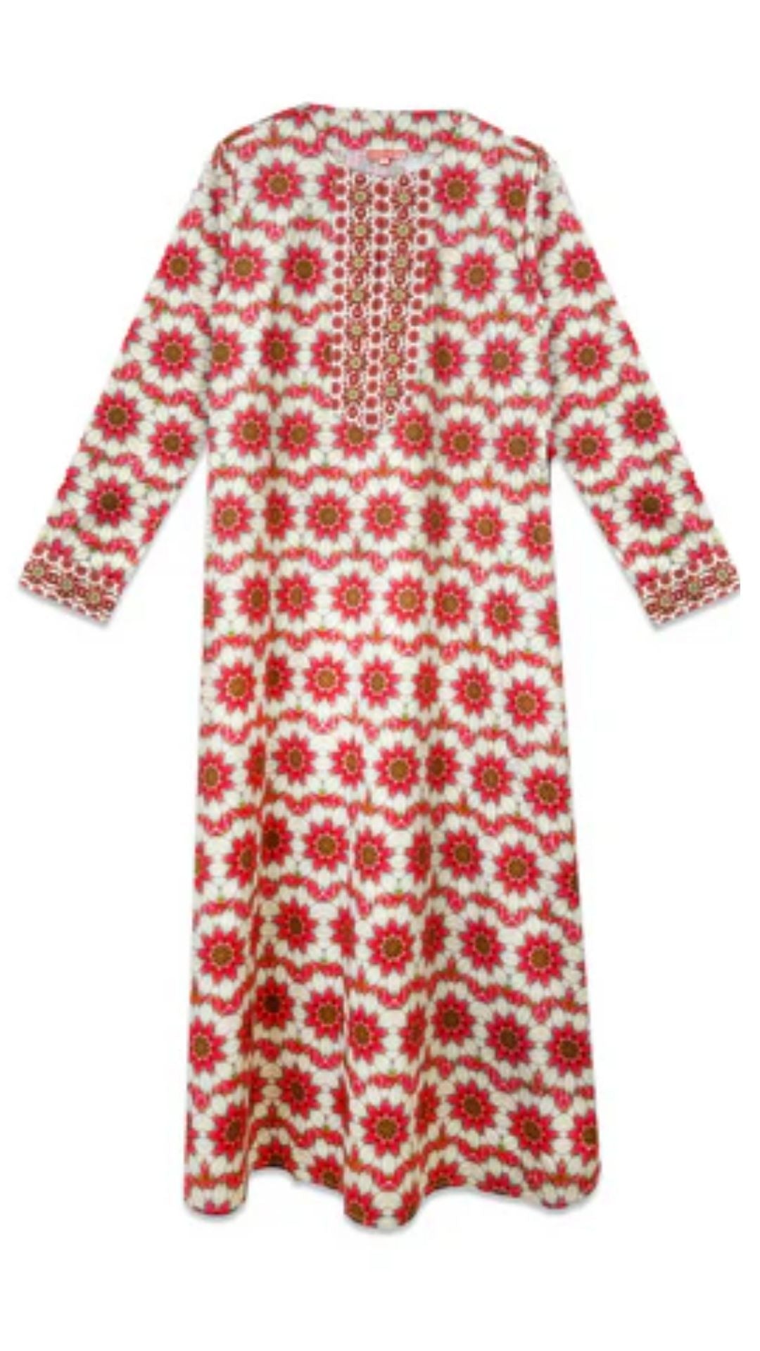 Day-to-night dresses are your wardrobe MVPs, and our kaftan is the ultimate standout. Crafted from a crisp cotton, this breezy yet elevated piece features our original Rosewood print and finished with beautiful hand beadwork at the cuff and placket. Whether you're styling it as a chic swimsuit cover-up for a resort getaway or pairing it with olive boots for effortless fall styling, this versatile kaftan can transition seamlessly with you throughout the seasons.