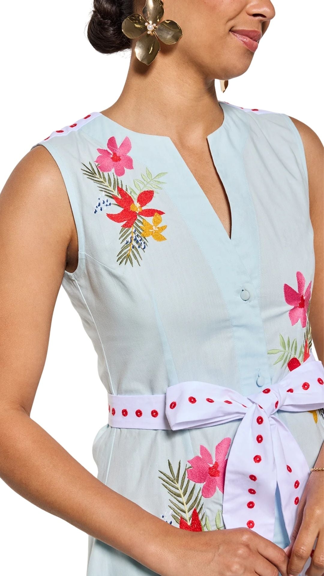 An elegant midi dress designed to feel effortless yet thoughtfully refined. Featuring a clean, sleeveless silhouette and a button-front closure, this style is finished with delicate floral embroidery placed to add color, dimension, and graceful movement.