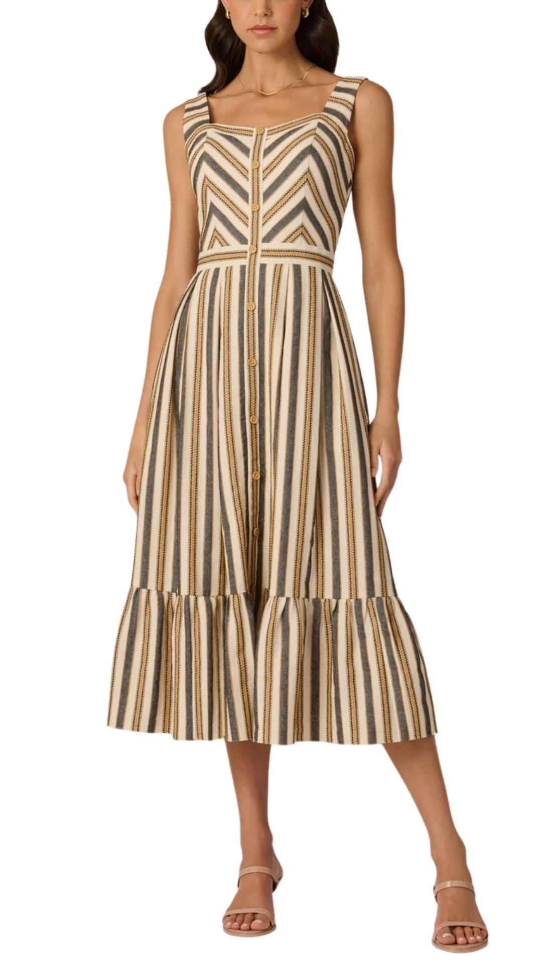 This adorable striped dress features a fitted bodice and a flowing skirt with side seam pockets. The stripes on the bodice are cleverly placed to form a chevron pattern. The front placket features wooden buttons. The bodice has interior boning for added support. Fully lined. Front placket is nonfunctional; invisible zip closure at center back.