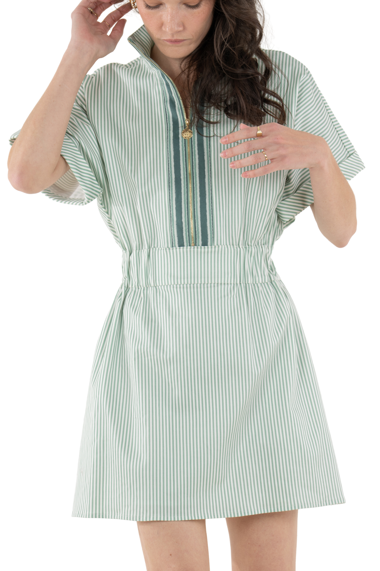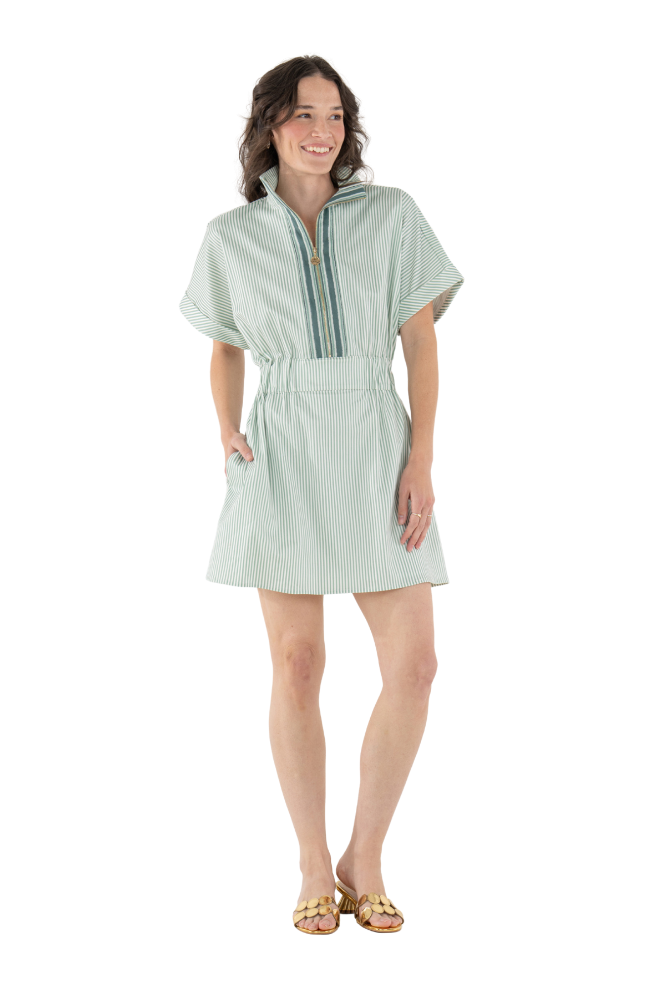 The Pullover Dress in Feldspar Stripe blends classic ease with a sporty, modern feel. Designed with a zip-front neckline finished with our gold logo pull, this style features short dolman sleeves, a cinched elastic waistband, and functional side pockets for everyday wear. Effortlessly versatile, it transitions seamlessly with a simple change of shoes or accessories—making it a polished, practical staple for spring and beyond.