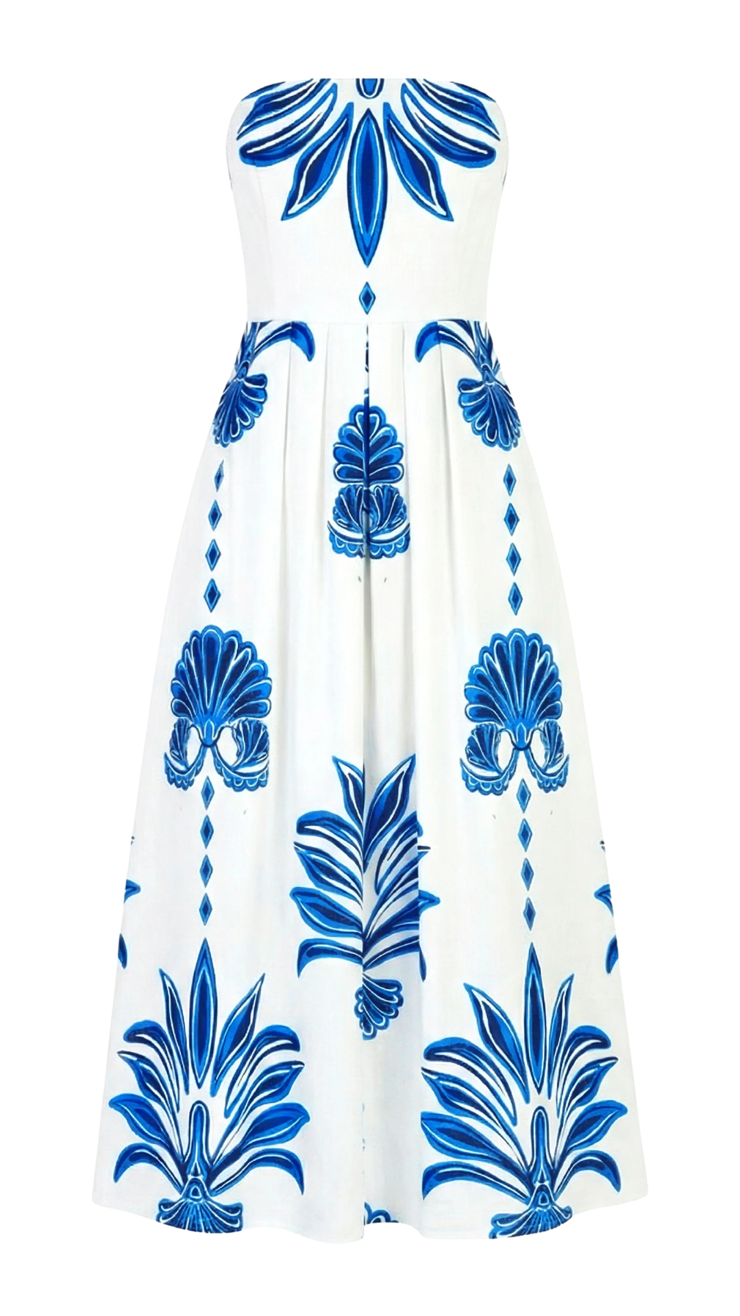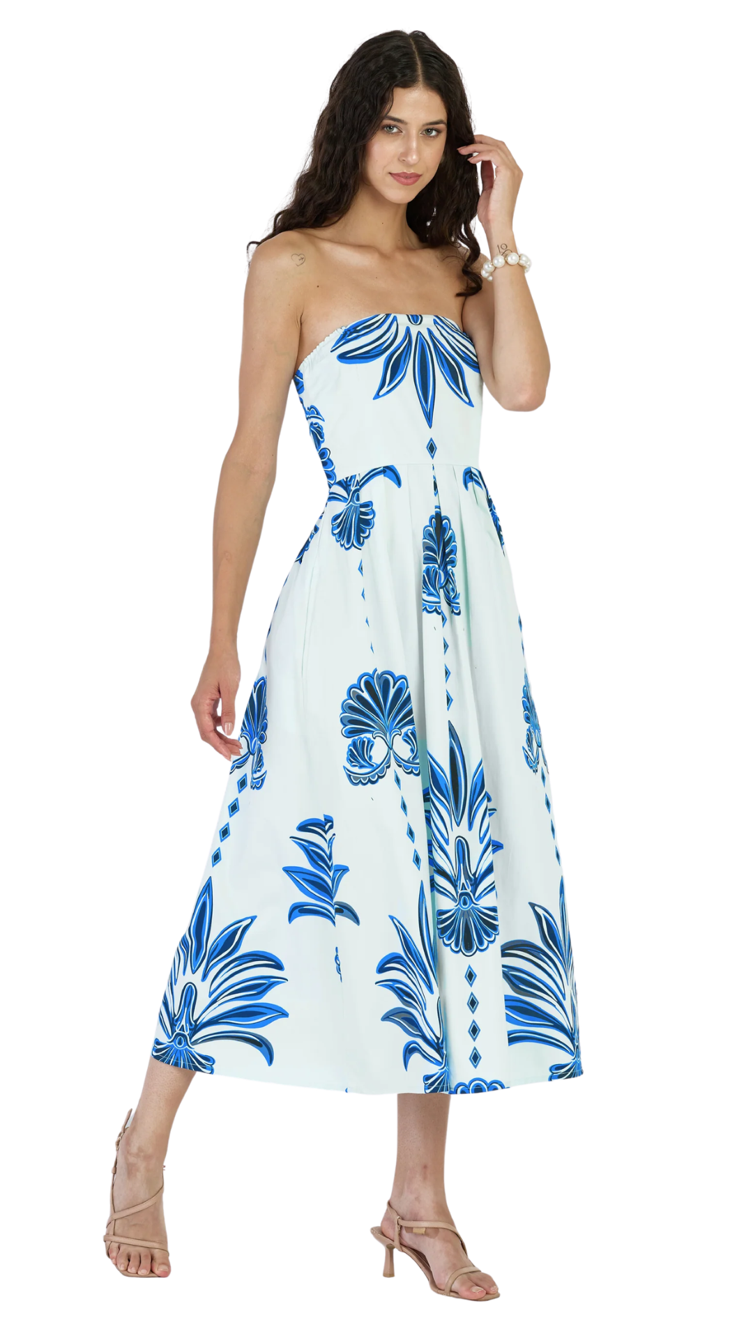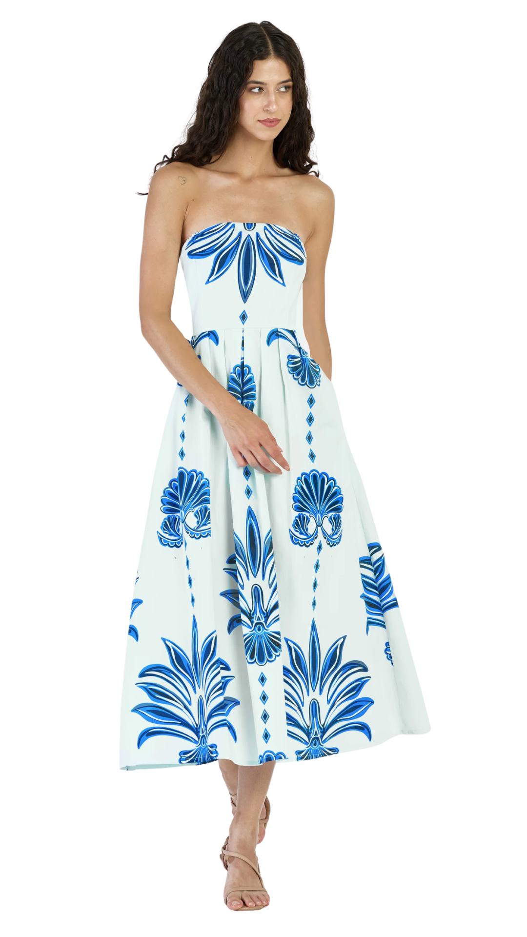 The Rory midi dress is designed with an elegant off-shoulder neckline and a fitted waist with elastic in the back for a flawless shape. Hidden pockets bring a fun, effortless touch, making Rory the perfect balance of style and ease for any occasion, day or night. Rory is made from breathable cotton twill, a softly structured fabric with a refined texture and elevated look. This print is inspired by Palm Springs in its golden days. The oversized leaf motifs channel the iconic sight of palm trees lining pools at private clubs, resorts, and villas, and evoke that luxe leisure mood.