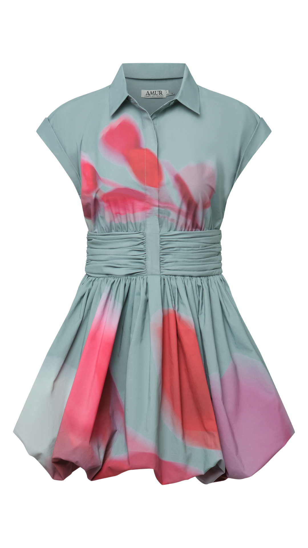 In airy printed poplin, this button-front dress balances structure with softness. A faux cummerbund waist teases shape before falling into a blooming bubble skirt. Light, playful, and quietly put-together—made for plans that start casual and go wherever.