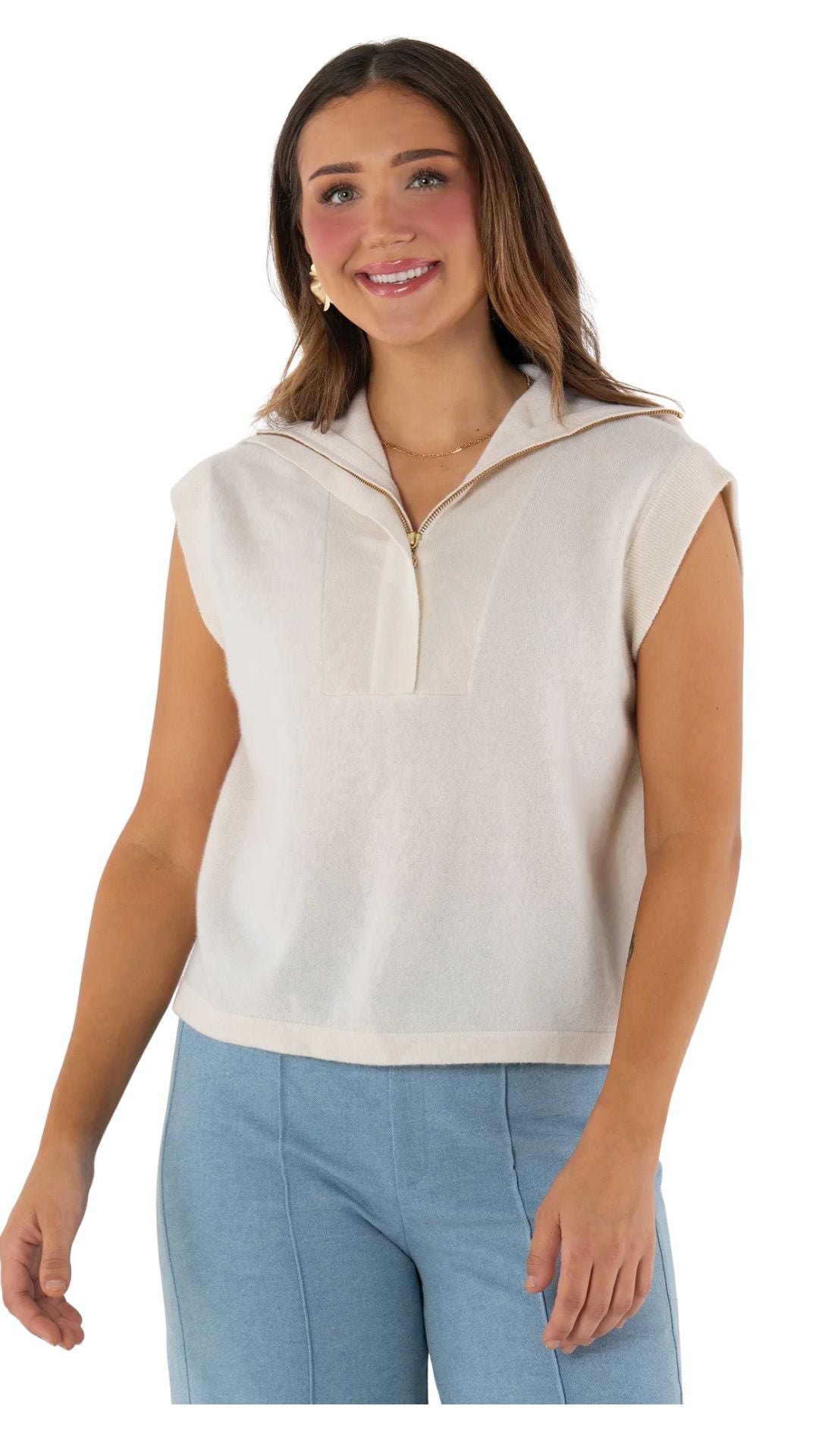 The Poppy Pullover Vest in Eggnog is a versatile piece designed for layering or wearing on its own. Crafted in 100% cashmere, it offers a soft, elevated feel with a relaxed silhouette. The oversized fold collar is accented by a gold logo zip closure, adding a luxe finish. Clean armhole lines and a slightly boxy cut give it a modern edge, while the hem sits neatly at the waist for easy styling with both trousers and skirts.
