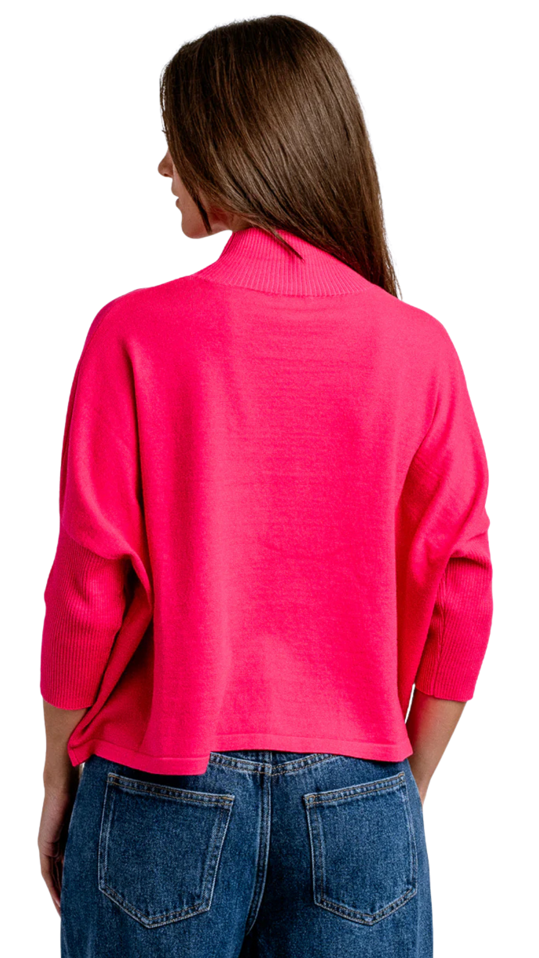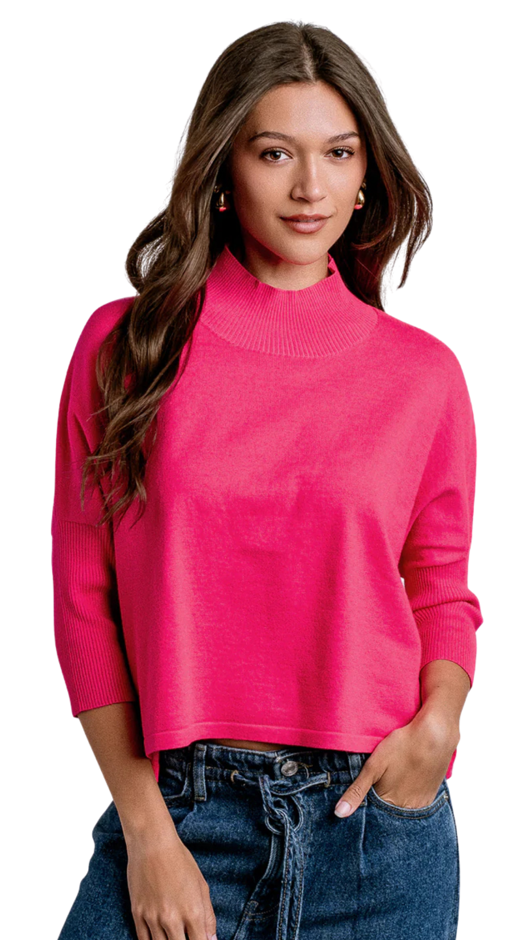 Boxy mock neck 3/4 sleeve top in solid color with rib hem accents.