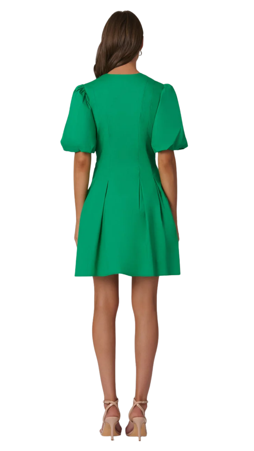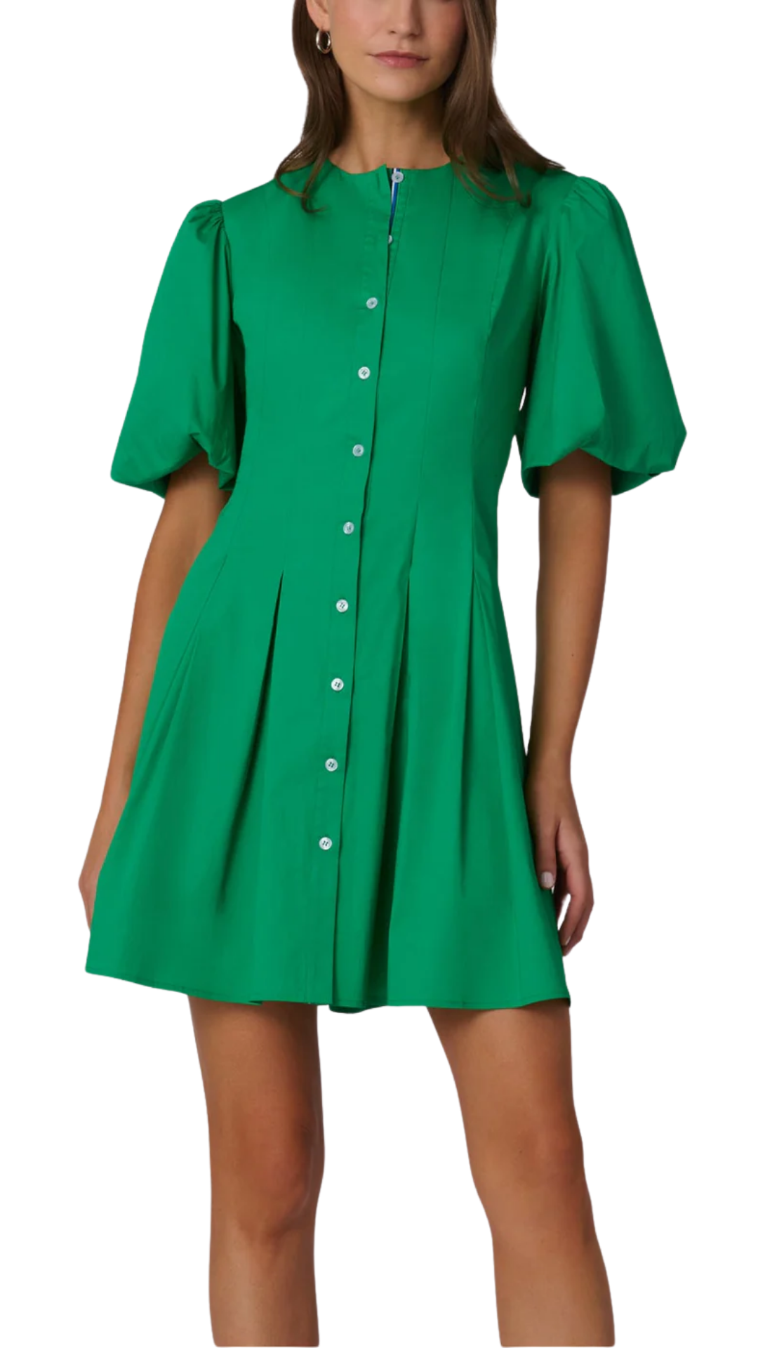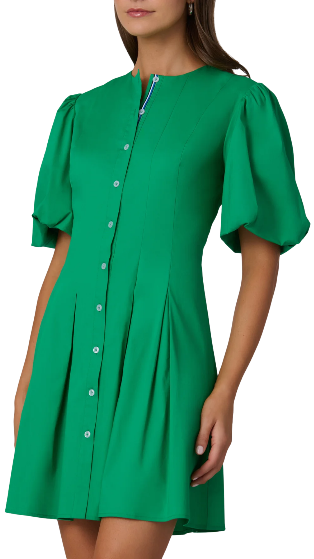 This super cute cotton mini has a functional front placket. The inside placket is embellished with a contrasting stripe ribbon. Fit and flare silhouette. Short puff sleeves with an elastic opening. Unlined.