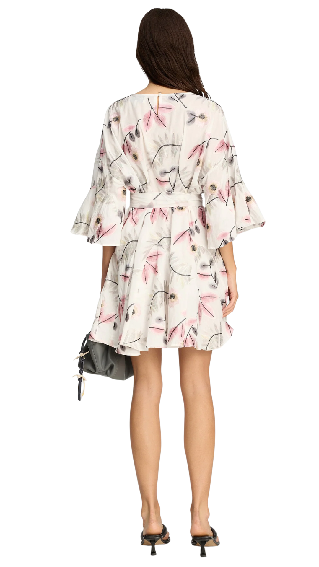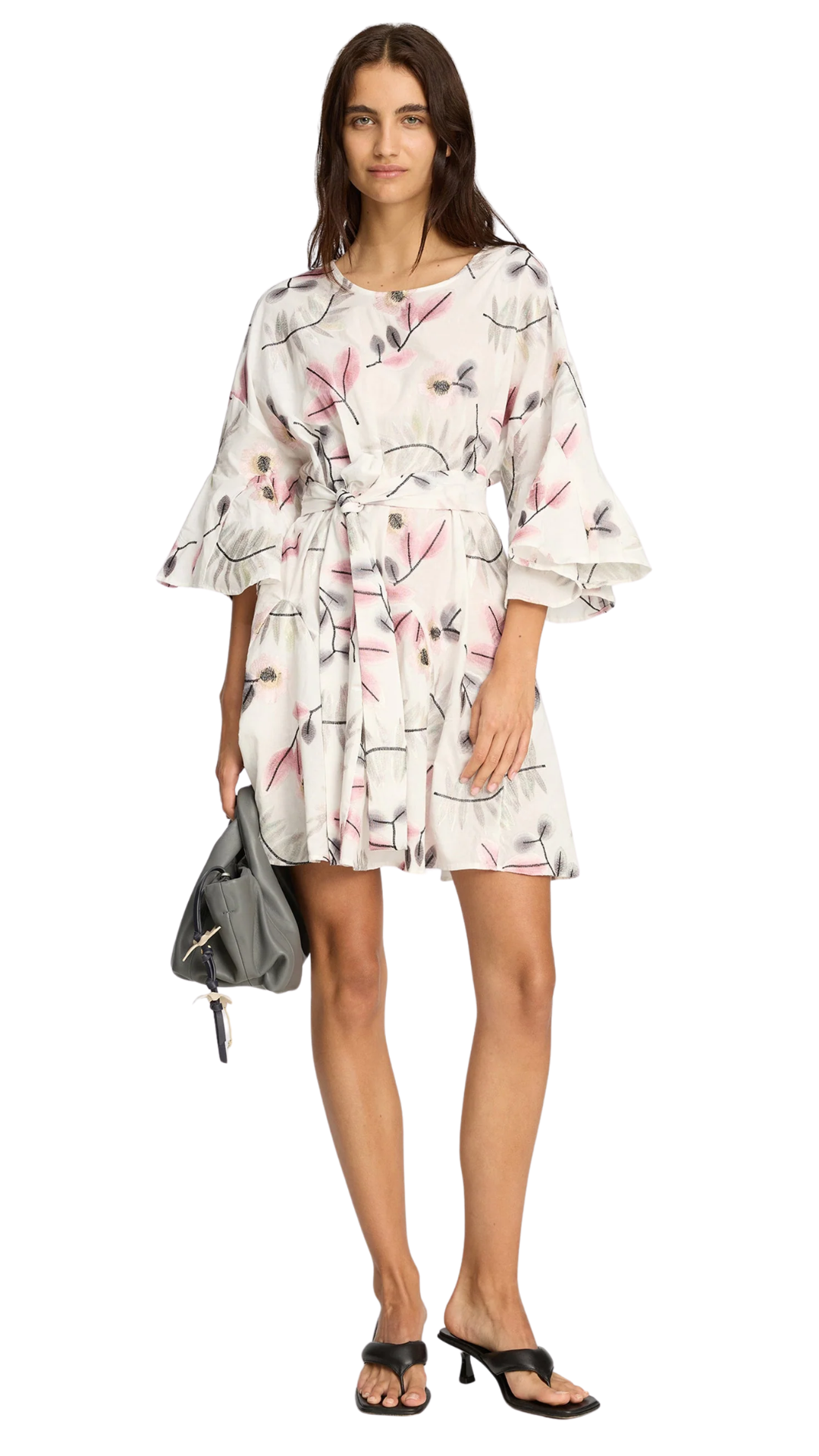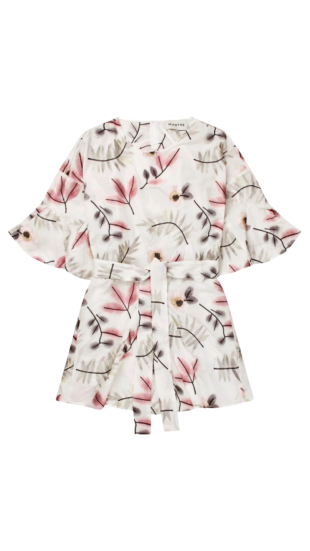 Dress made from a lightweight fabric featuring a botanical print in pink and muted tones. It has a relaxed silhouette with short, subtly flared sleeves and a matching tie belt that adjusts at the waist. A versatile piece that works beautifully for multiple occasions.