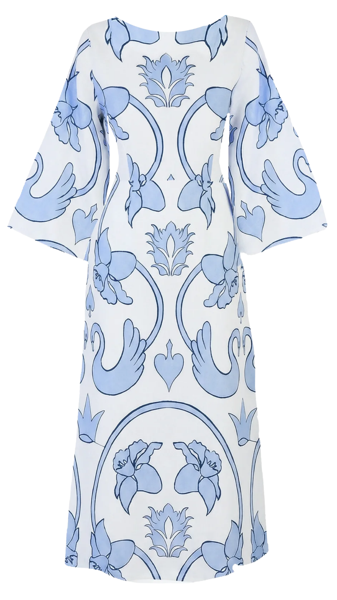 The Camelia dress is the epitome of chic versatility, designed with a flattering A-line silhouette that nips at the waist. Its elegant boat neck and slim-cut shoulders transition into forgiving bell sleeves that cascade effortlessly, combining sophistication with comfort. Perfect for those who appreciate a figure-skimming style that's as easy to wear as it is stylish. Camelia is crafted from a unique blend of cotton and linen, offering a soft, breathable feel and a beautifully textured finish. Channeling the quiet glamour of Monaco’s golden era, this print is designed for a modern Grace Kelly. Bold motifs of swans, crowns, and daffodils reference royal heritage and refined glamour.
