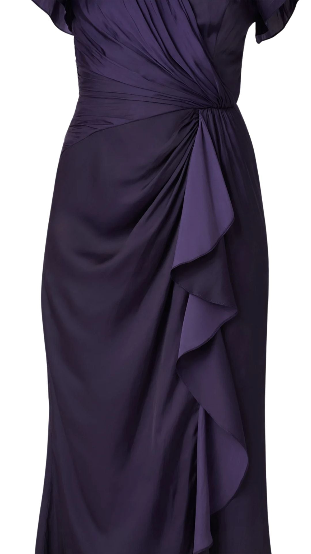 Chic satin dress with intricate draping details. This style has a crew neckline and flutter sleeve, with flattering draping on the bodice, leading into a cascading skirt with a small front slit. This lightweight and soft fabric is unlined and has a center back zipper closure.