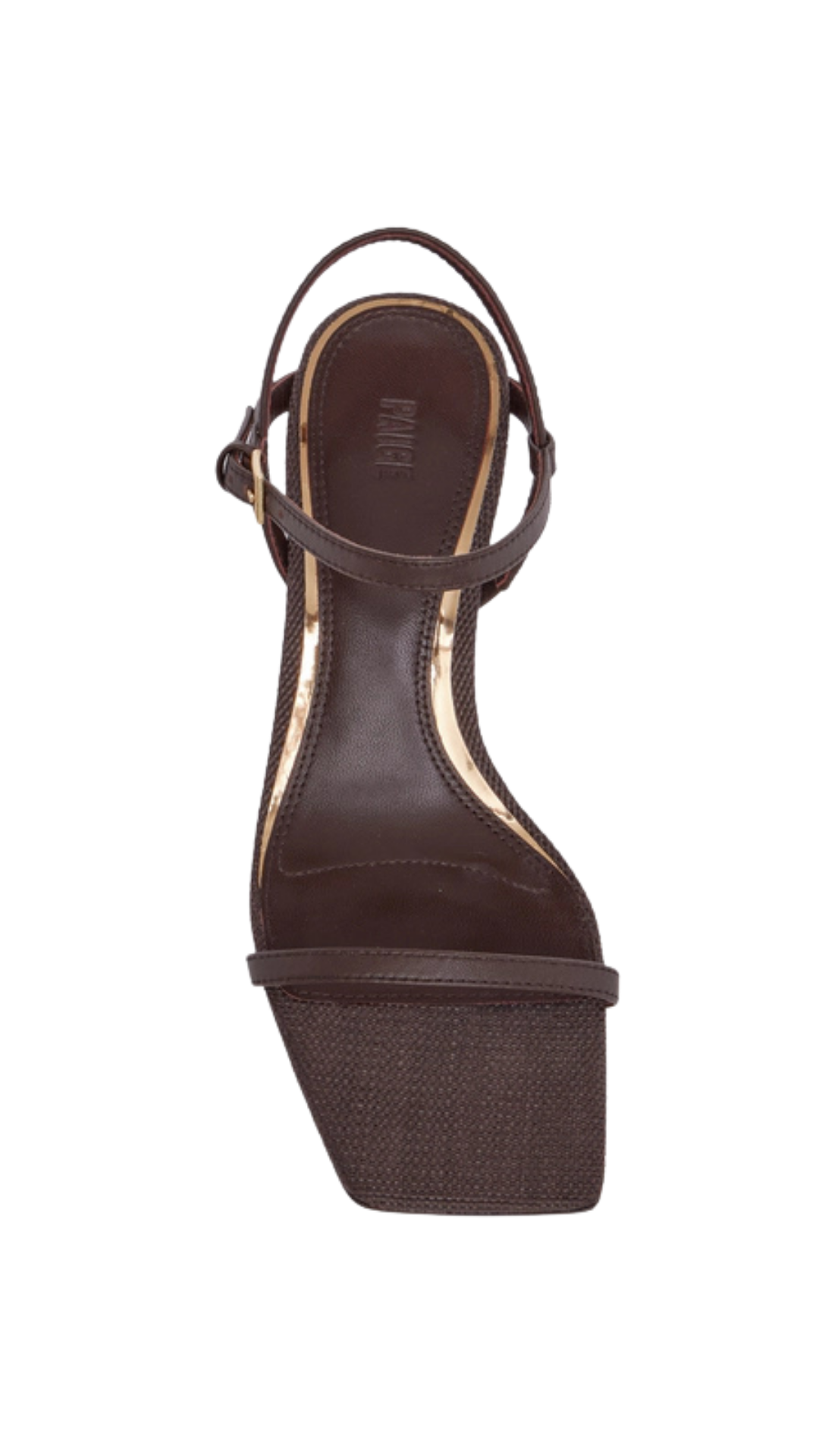 A chic mid-heel sandal in ultra-luxe coffee brown leather with a tonal raffia wrapped footbed for an added pop of textured contrast. Ella is designed with interlocking micro straps secure with a brushed warm gold metal half buckle closure at the ankle, while the upper wrapped kicked-in stiletto heel and elongated sharp square toe shape adds a modern, refined edge.