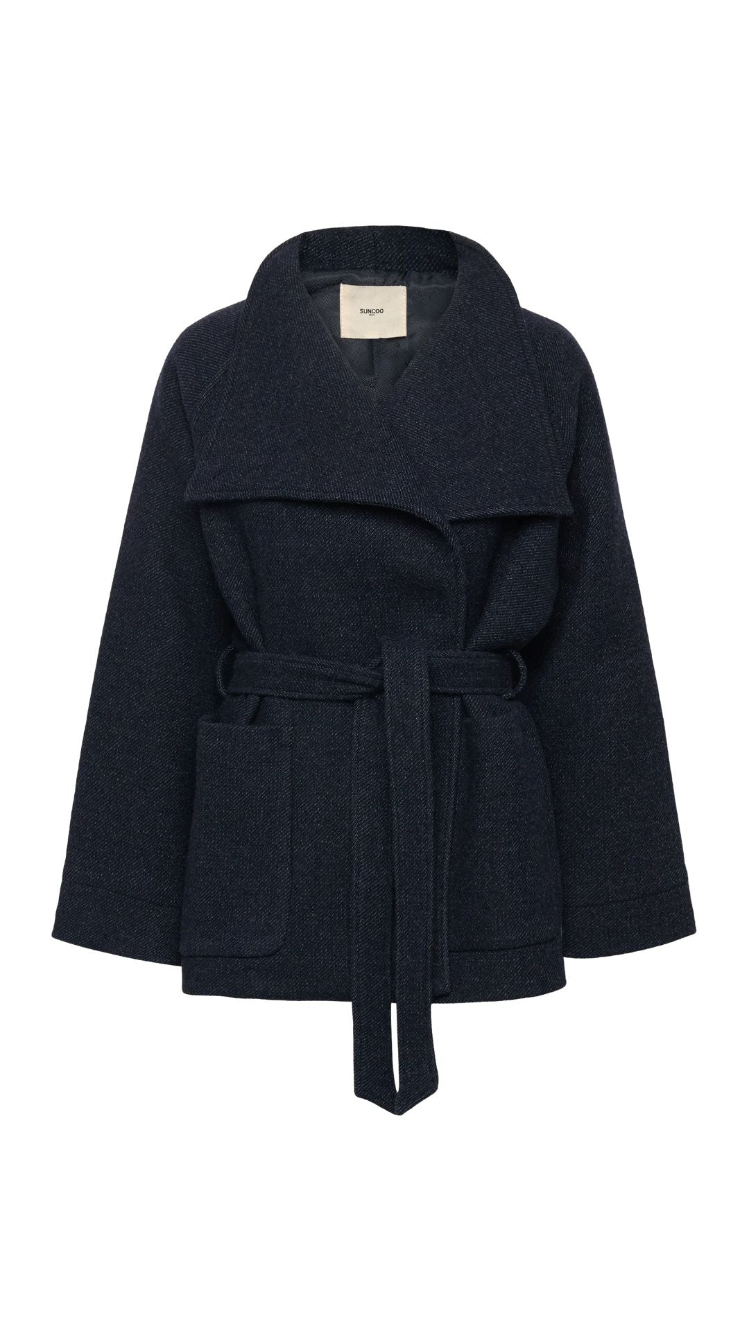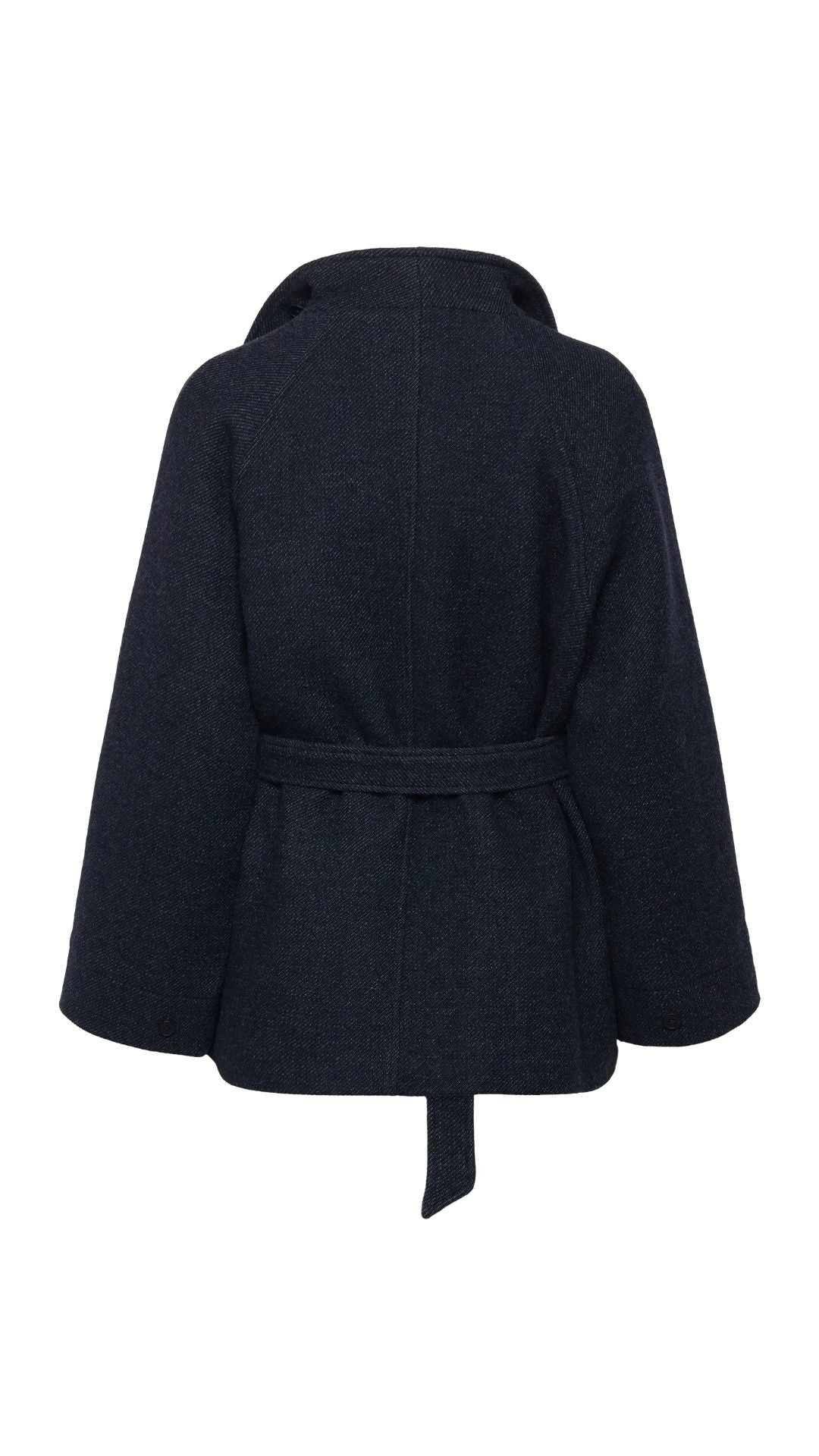 -Belted woollen coat -Shawl collar -Removable tone-on-tone belt to tie -Two large side pockets -Made from recycled wool and recycled polyester