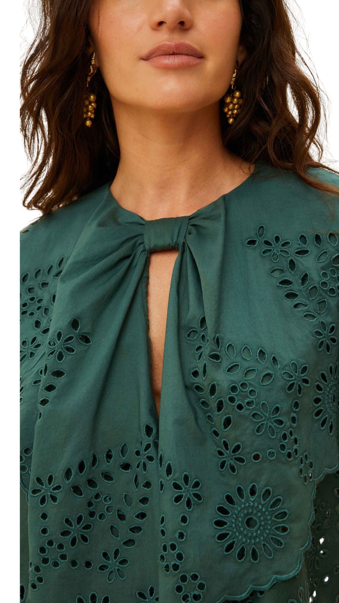 Embrace the playful elegance of the Green Maxi Lace Blouse by FARM Rio. Crafted in a lush green hue, this piece features delicate floral eyelet patterns that dance across the fabric. The enchanting design is elevated by a layered cape-style silhouette, perfectly complemented by airy puff sleeves. A charming round neckline effortlessly ties it all together, making it an irresistible addition to your wardrobe.