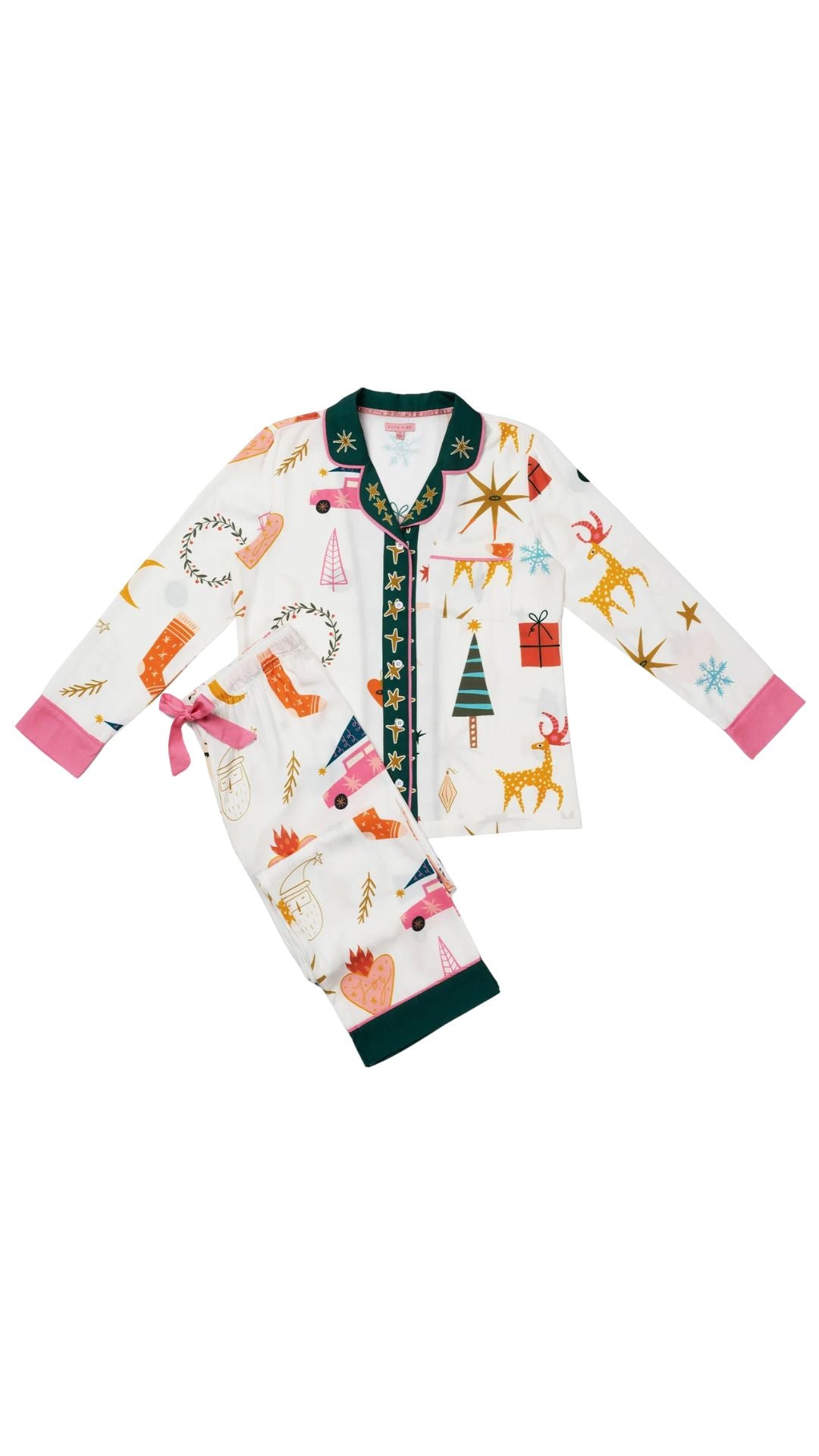 The Katie Kime Mod Holiday print is a colorful wink to festive memories, this nostalgic print captures the joy of the season—then and now. Our Women’s Pajama Pants Set—that also passes as WFH loungewear—is the perfect combination of comfort meets fashion with its classic shape and features. From the piping detail to the adjustable ribbon waist, this set offers a favorable fit on all. Add a bespoke touch with your choice of monogram. 50% Modal & 50% Cotton light and airy with classic piping detail pants have an elastic waist with adjustable ribbon tie If you choose to monogram, it will be placed on the front left chest pocket. Please note when monogramming, the pocket will be sewn shut and the backing will soften after washing.