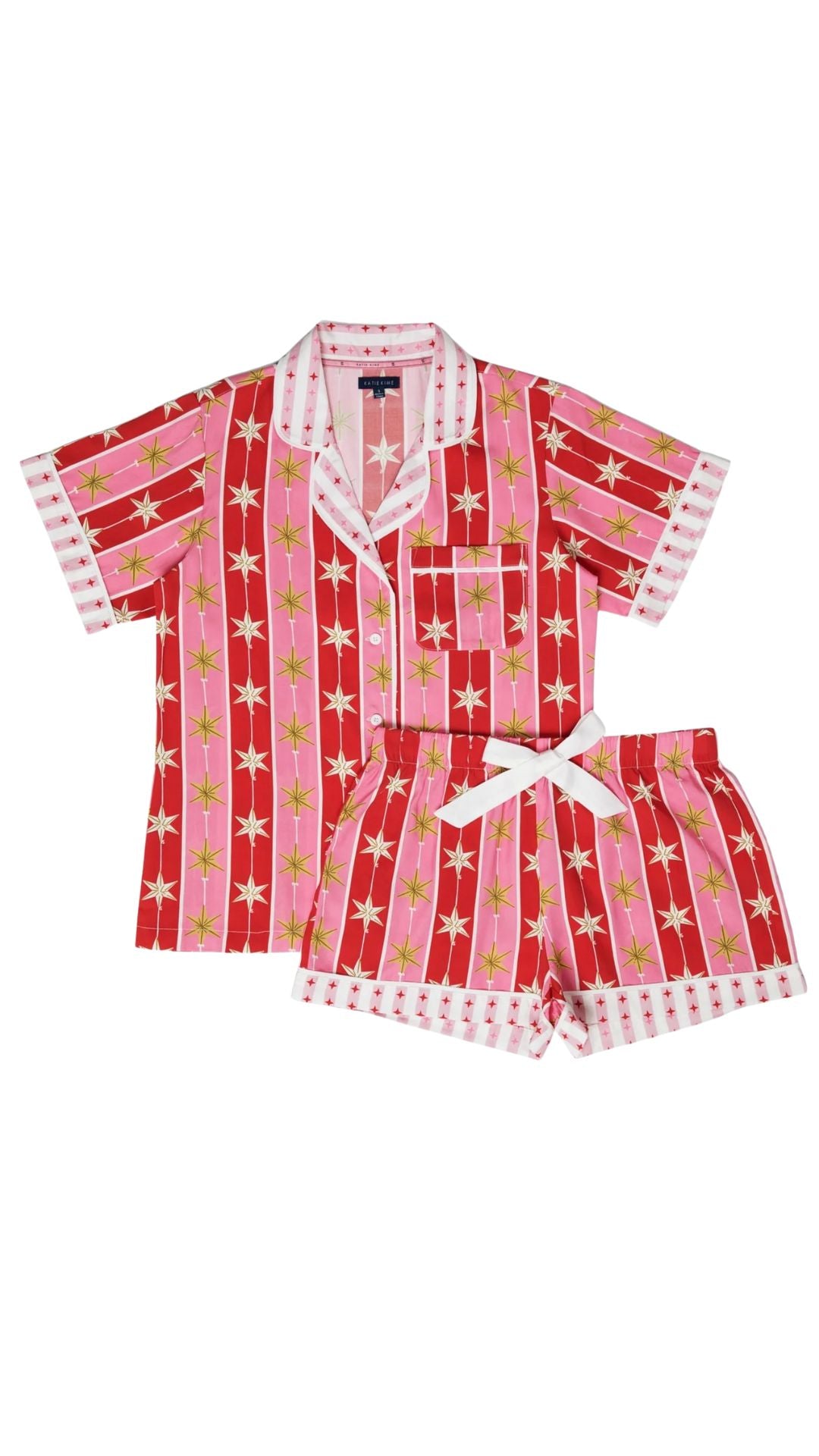 Bold red and pink stripes meet a string of stars in our Katie Kime Tree Topper print, a playful twist to classic holiday style. Our Women’s Pajama Shorts Set — is cut in a timeless silhouette with classic piping detail. The shorts’ elastic waist and adjustable ribbon tie ensure a custom, universally flattering fit. Add a bespoke touch with your choice of monogram. 50% Modal & 50% Cotton light and airy with classic piping detail shorts have an elastic waist with adjustable ribbon tie If you choose to monogram, it will be placed on the front left chest pocket. Please note when monogramming, the pocket will be sewn shut and the backing will soften after washing.