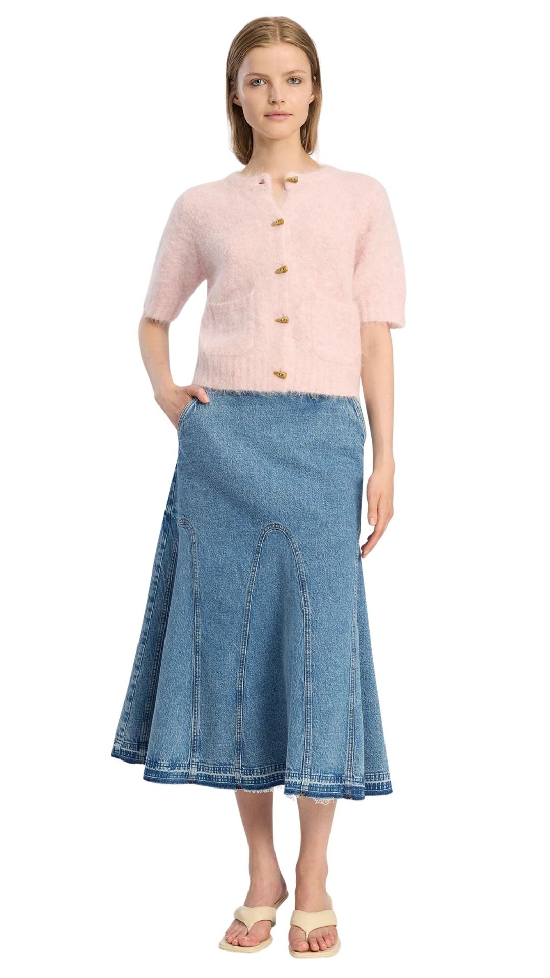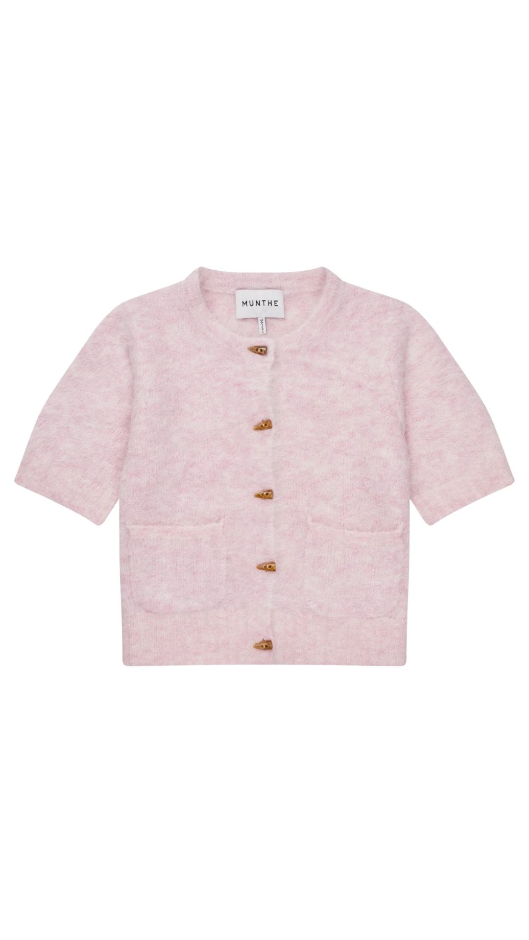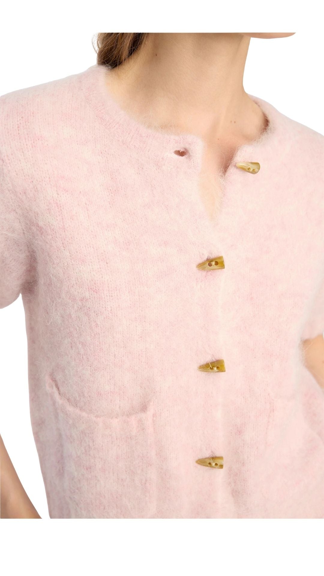 Cardigan with short sleeves, front pockets and faux horn buttons. This cardigan is designed with an elegant brushed finish and in 55% alpaca.
