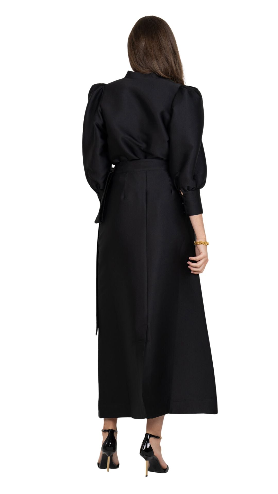 The Audrey Skirt in Midnight is a timeless wrap silhouette designed with a high waist and a tacked side belt that ties into a voluminous bow. Crafted in a structured fabric with a subtle sheen, this maxi-length style drapes with polish and ease. A versatile piece for your capsule wardrobe, it pairs effortlessly with everything from statement tops to sleek knits, making it a refined choice for elevated dressing this season.