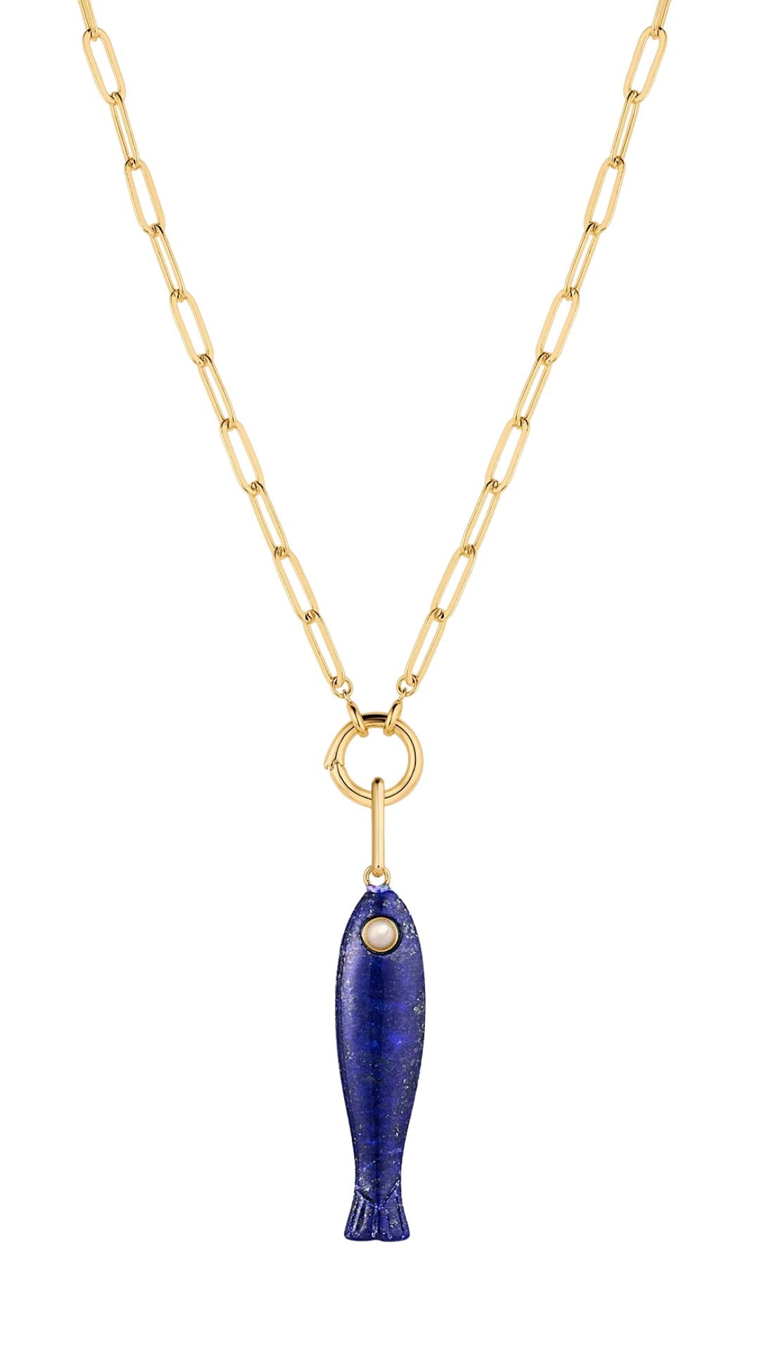 She's a best seller for a reason. Our new favorite hand-carved gemstone fish charm has quickly become the must-have charm of the season. This lapis fish (with a mother of pearl eye!) is paired with a beautiful 18 inch paperclip chain. Our Fortuna isn't just a cute charm, it's a little amulet for good fortune and luck.